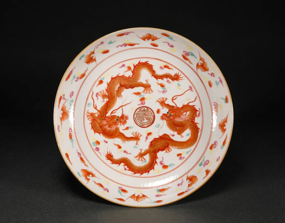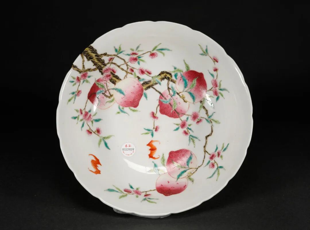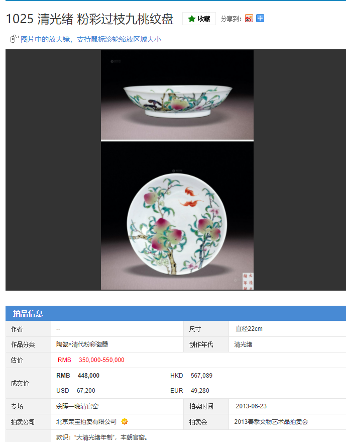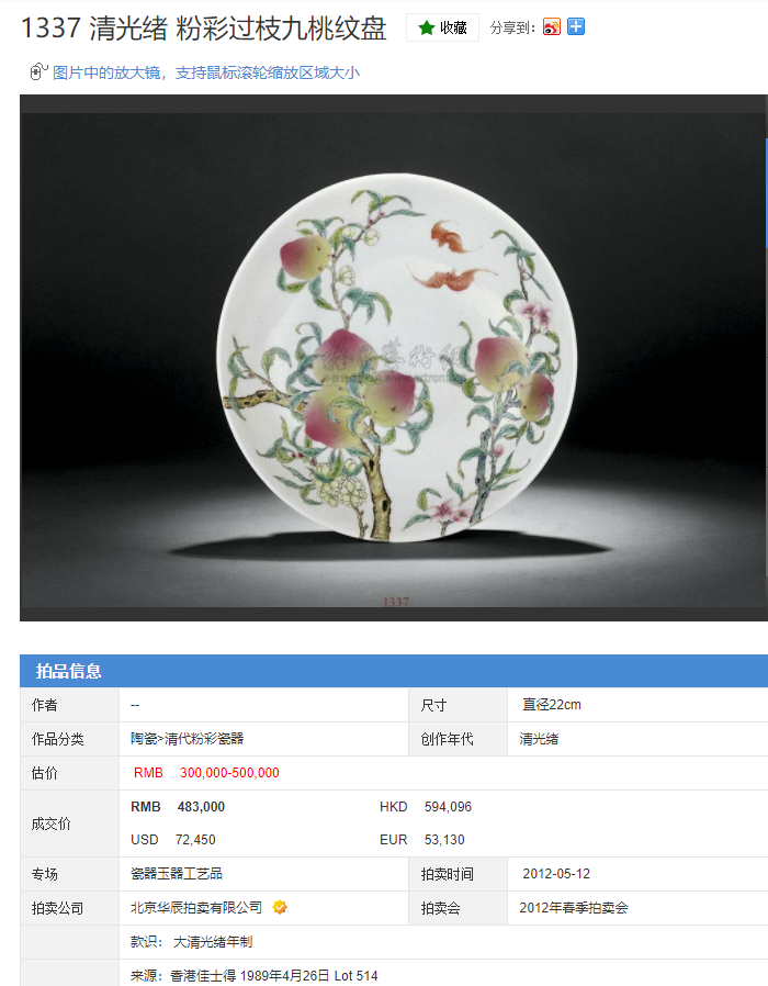参阅:北京荣宝2013春拍 lot1025 “清光绪 粉彩过枝九桃纹盘” 成交价RMB448000、北京华辰2012春拍 lot1337“清光绪 粉彩过枝九桃纹盘”成交价RMB483000