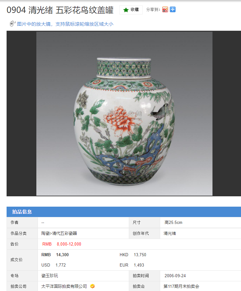 参阅:2006年太平洋国际第117期拍卖 lot0904 “清光绪 五彩花鸟纹盖罐” 成交价RMB14300