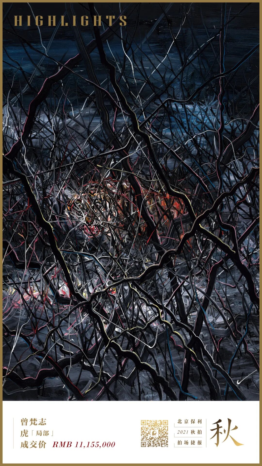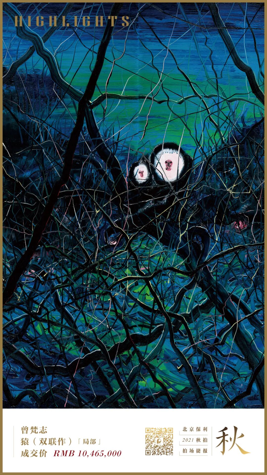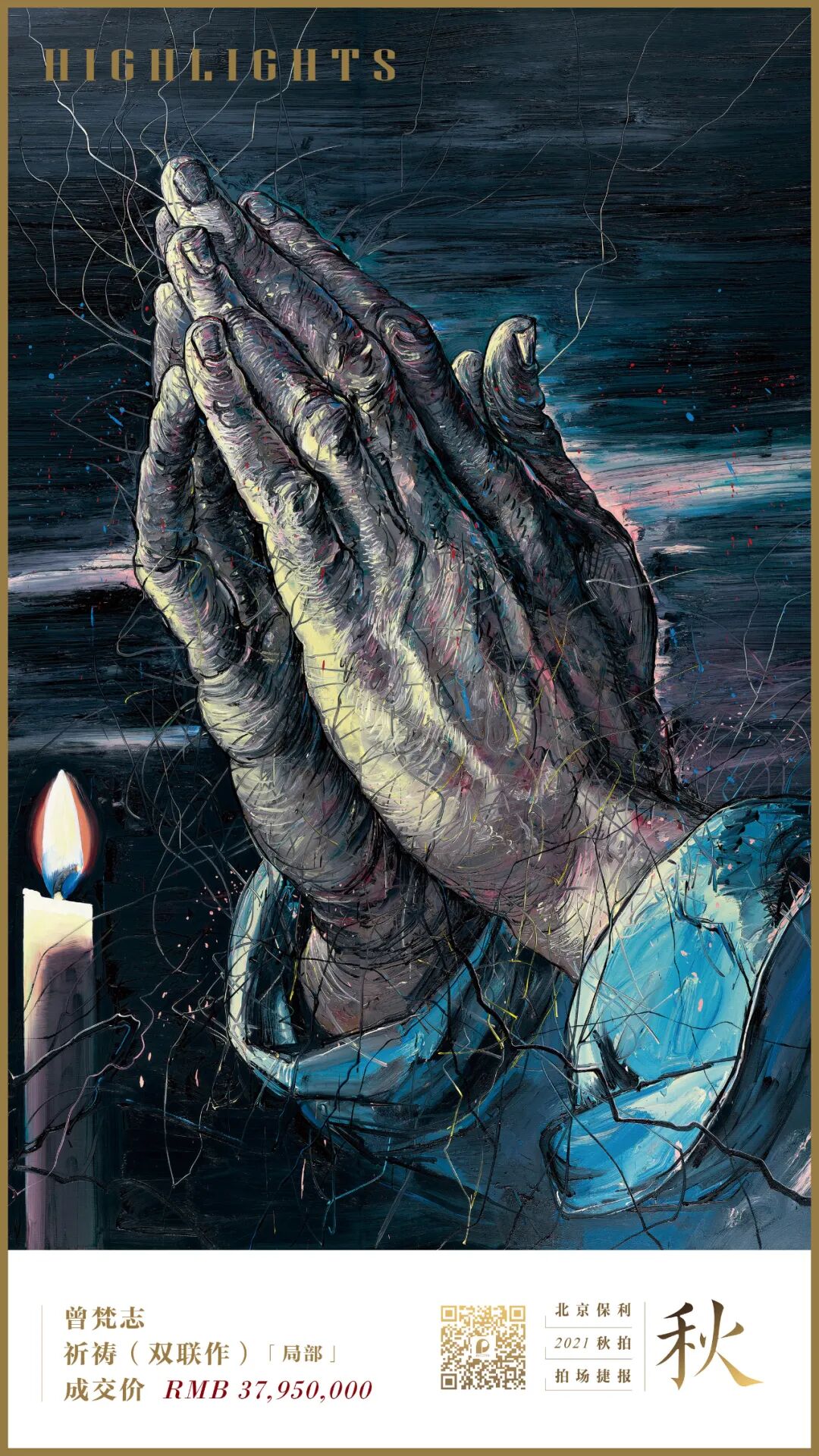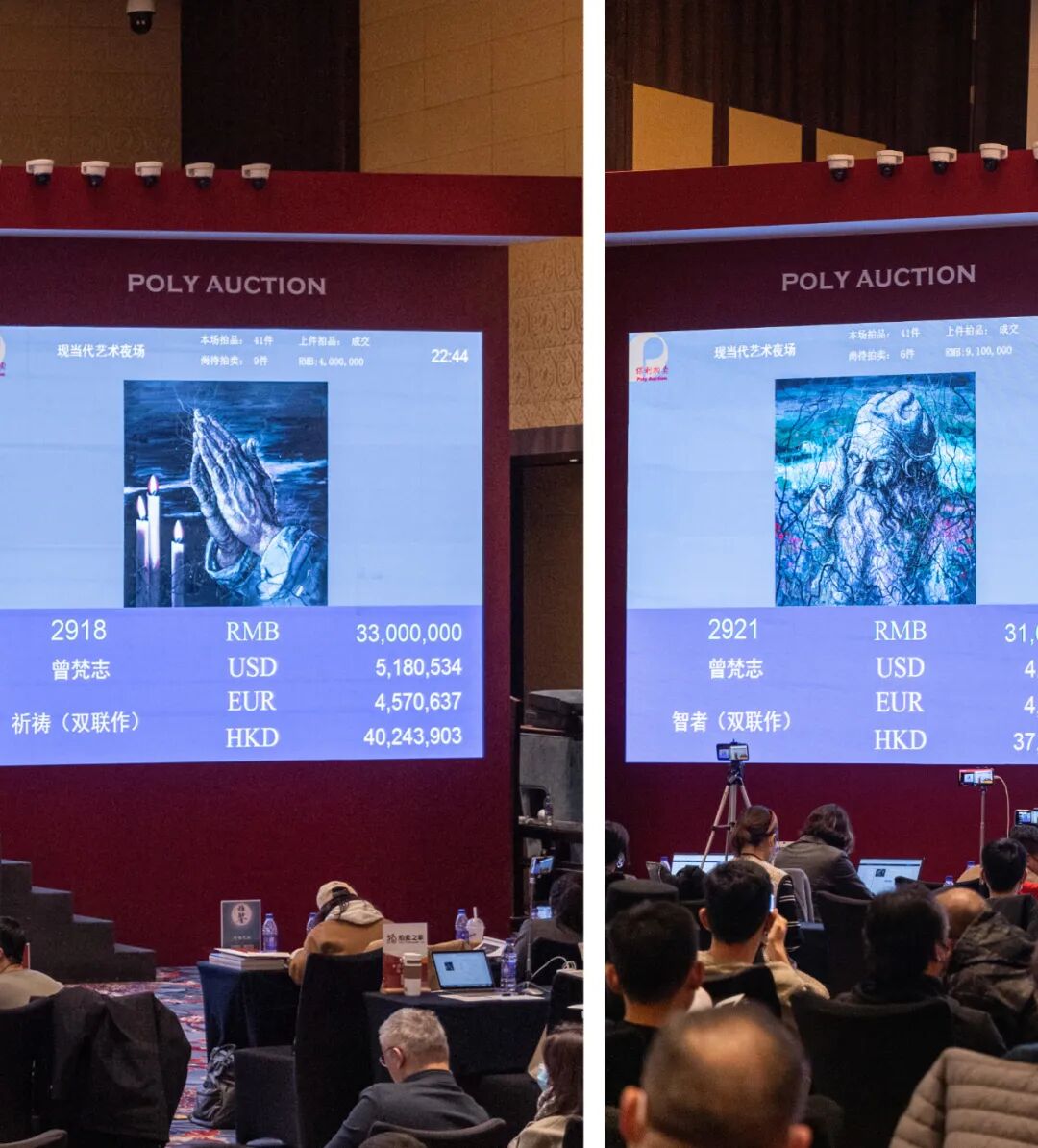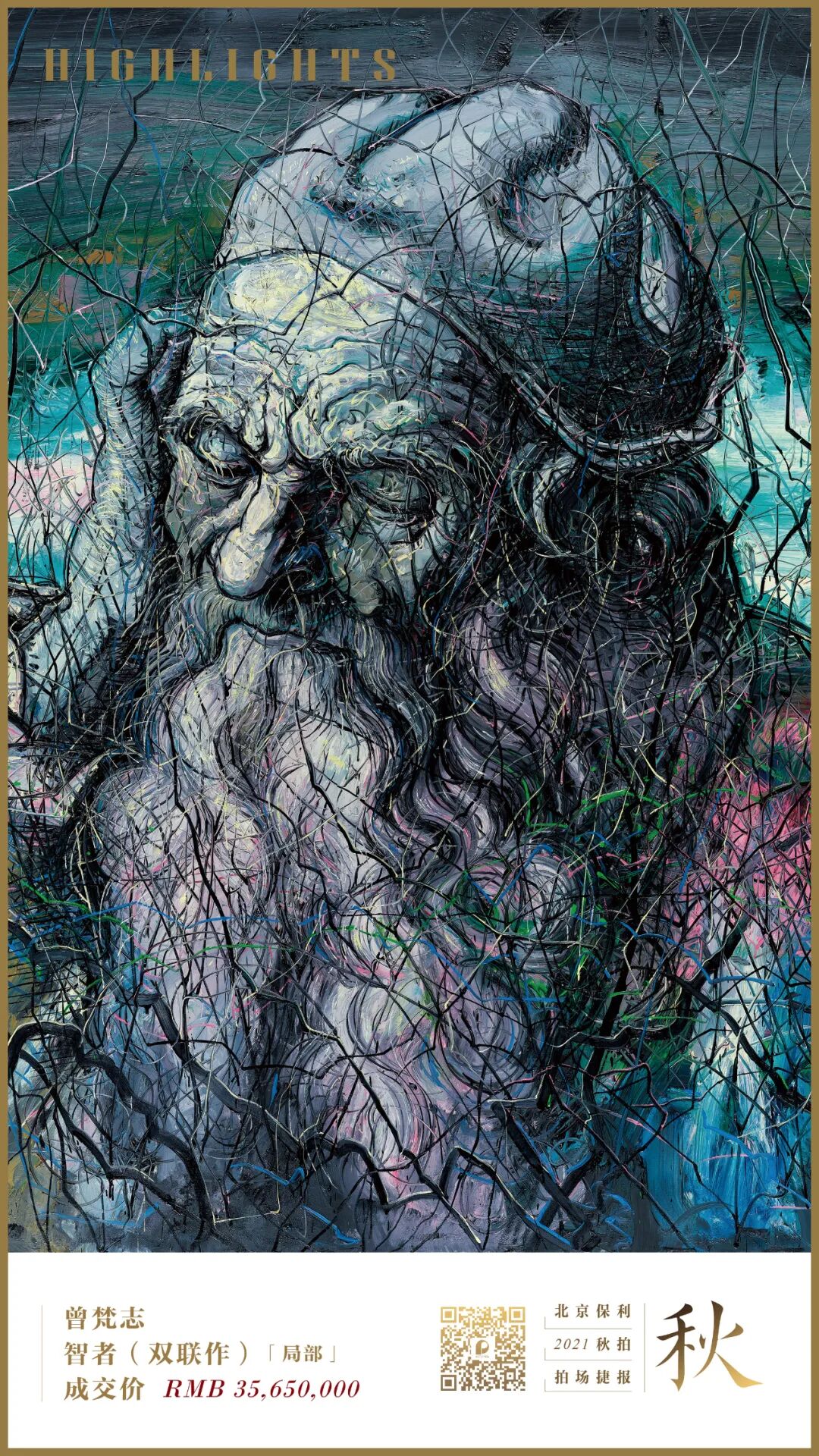 ●9件作品組成的「曾梵志藝術專題」斬獲了近1.236億元的總成交額,首現拍場的《祈禱》《智者》分別以3795萬元、3565萬元成交