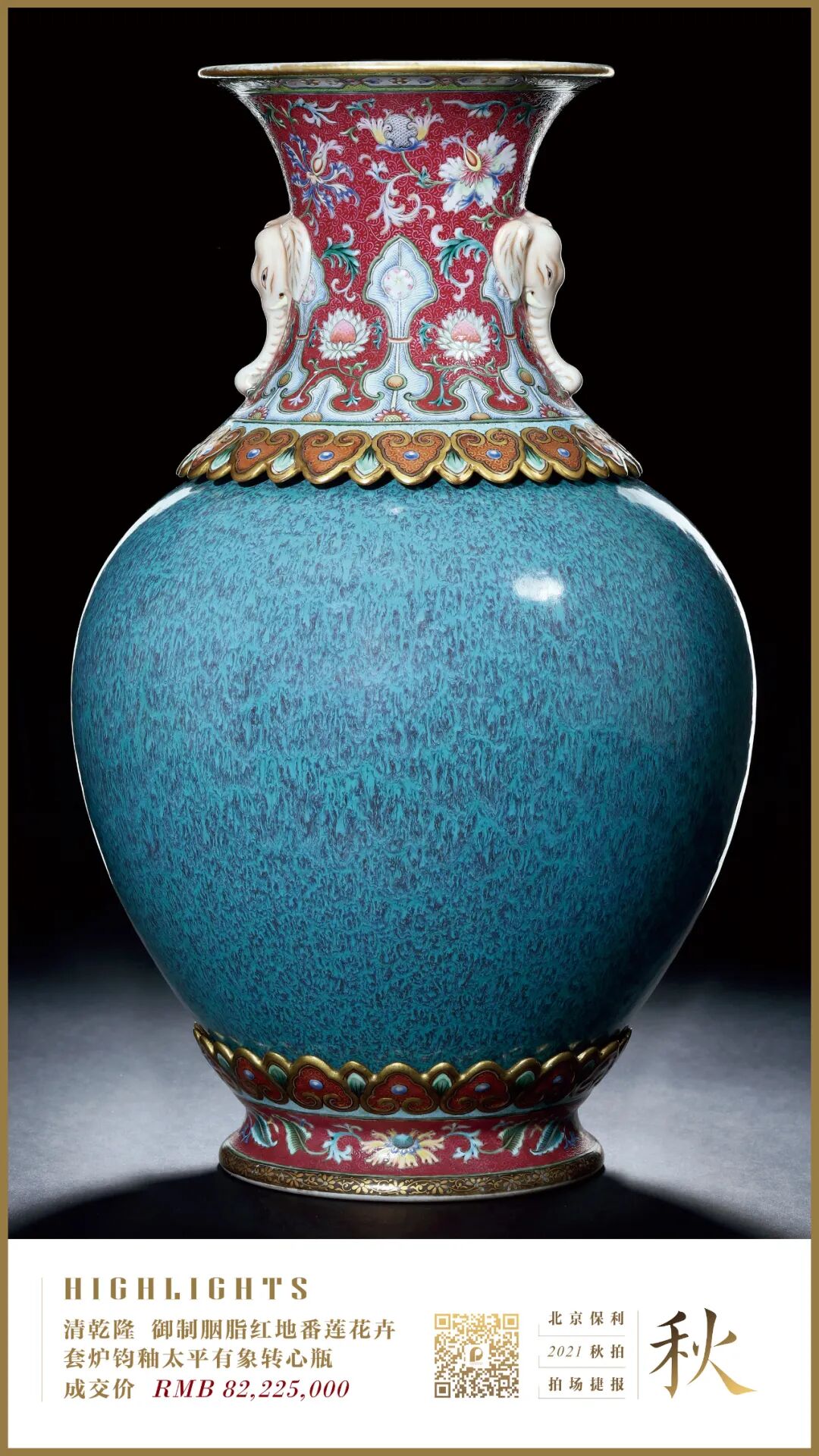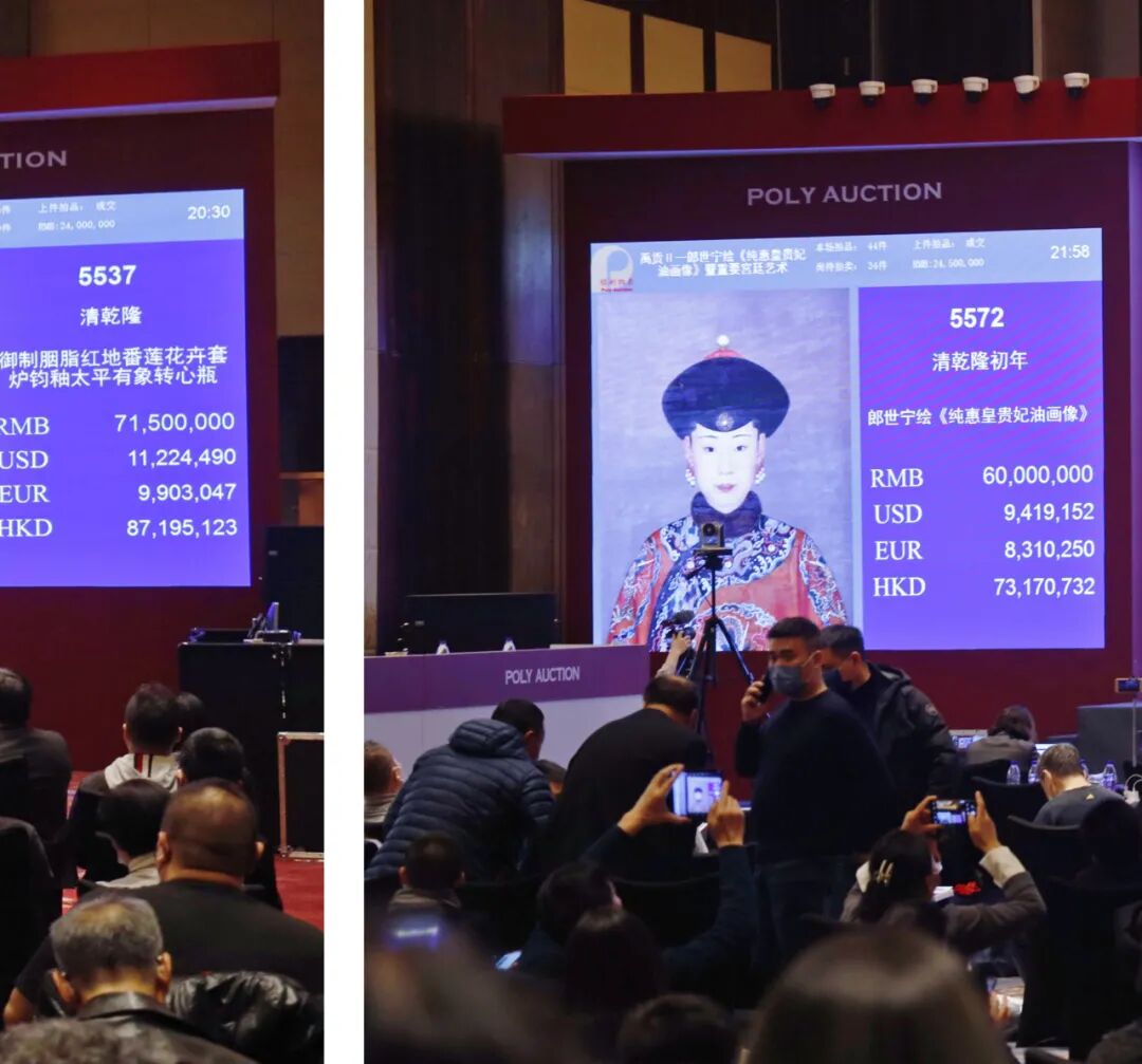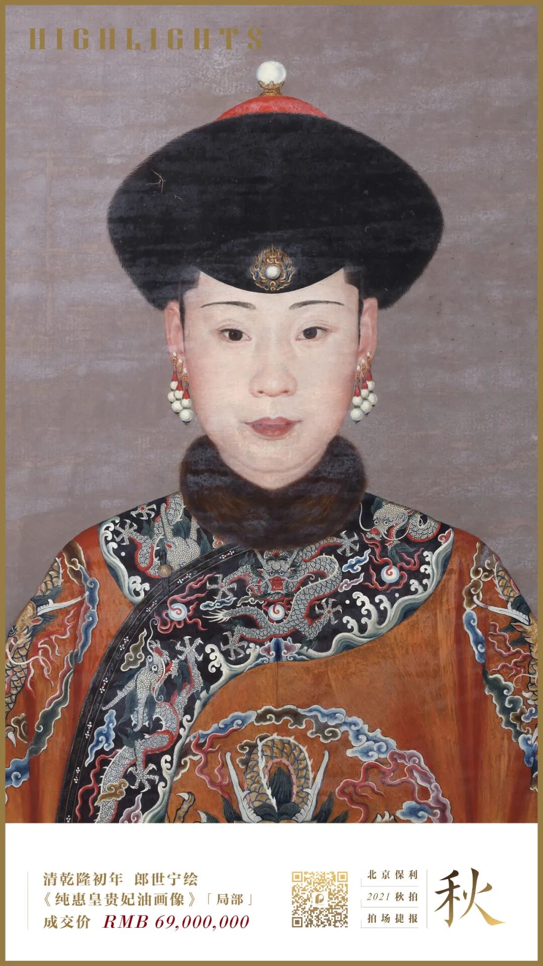 ●26件千萬元級拍品,御製胭脂紅地番蓮花卉套爐鈞釉太平有象轉心瓶以8222.5萬元成交,清乾隆初年 郎世寧繪《純惠皇貴妃油畫像》以6900萬元成交