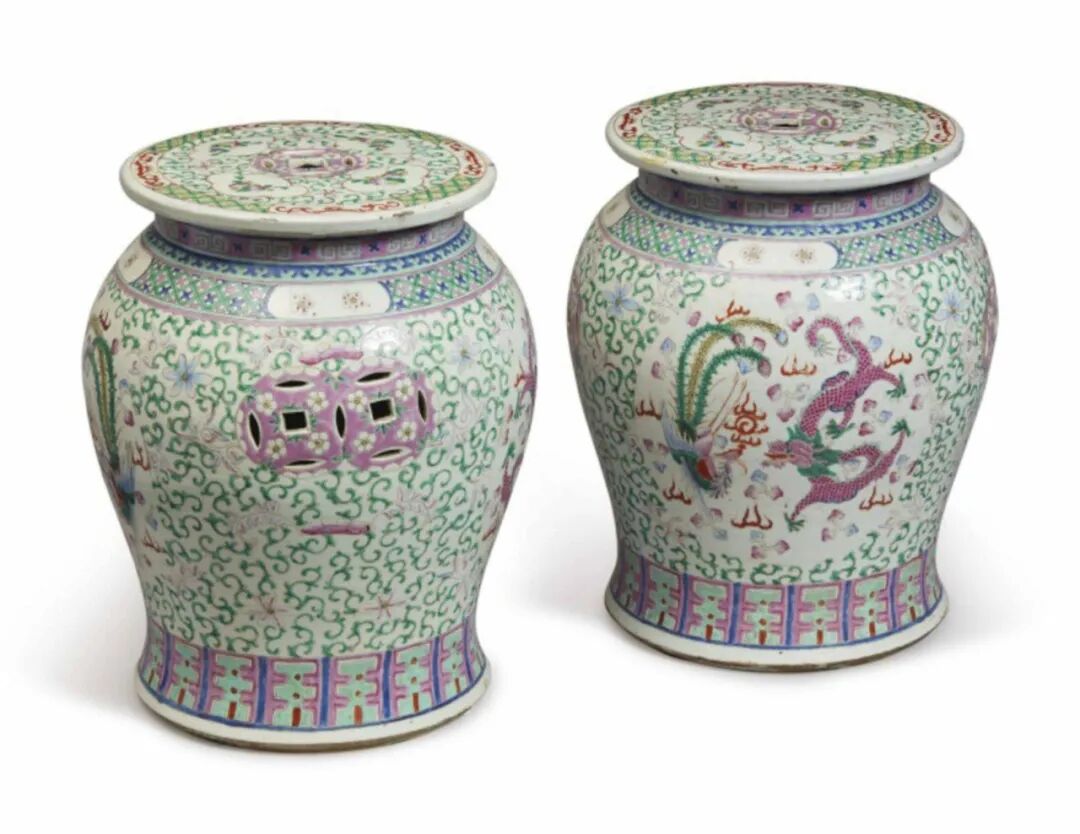 来源:苏富比纽约,2020年9月18日,博古:亚洲艺术珍品,Lot 1034来源:华裔企业家Kee Chiu 的遗产。购自 CHEW YING LUNG & CO., 738 Sacramento ST, San Francisco, CA。Lot 505 二十世纪初 粉彩开光龙凤呈祥纹坐墩一对
