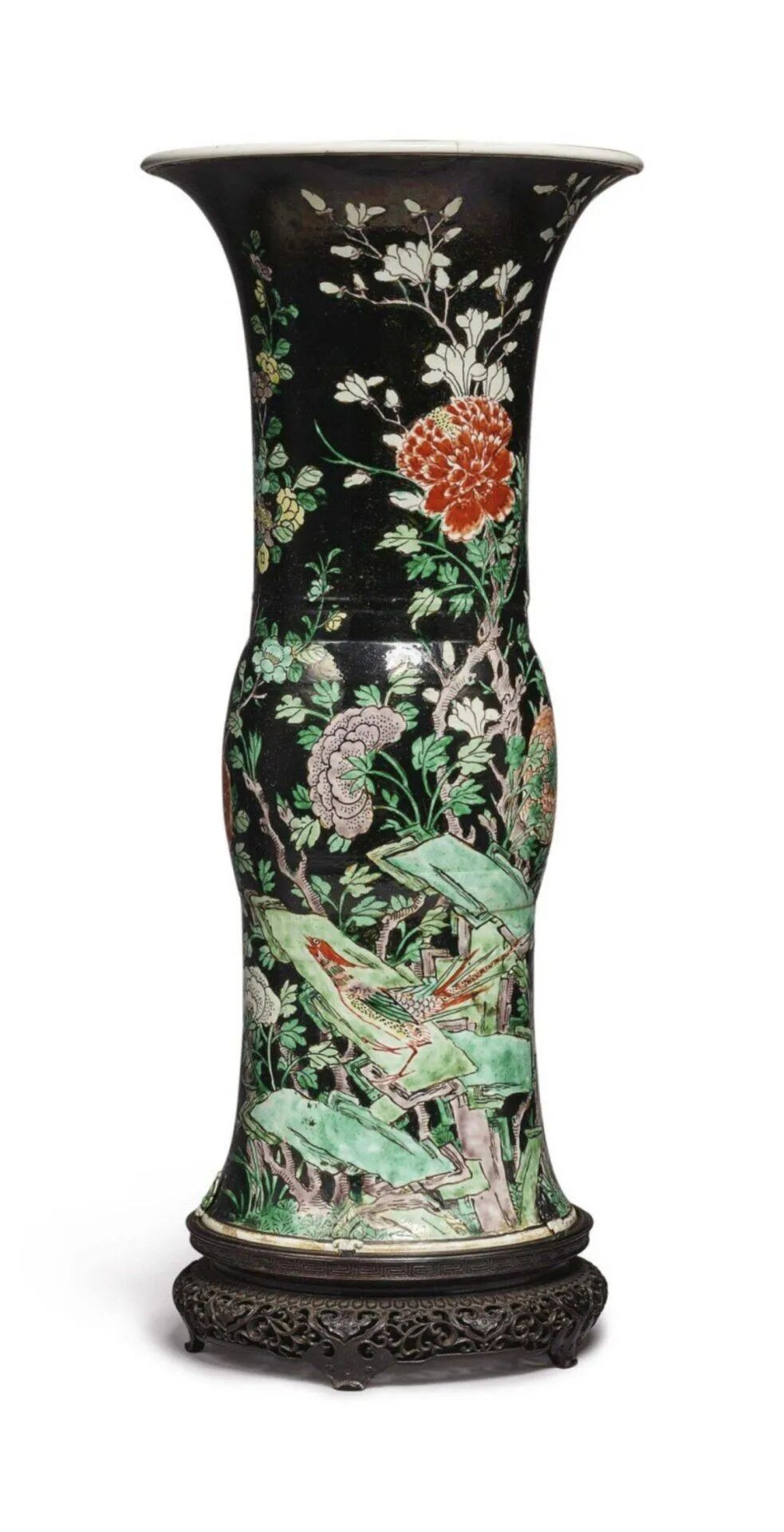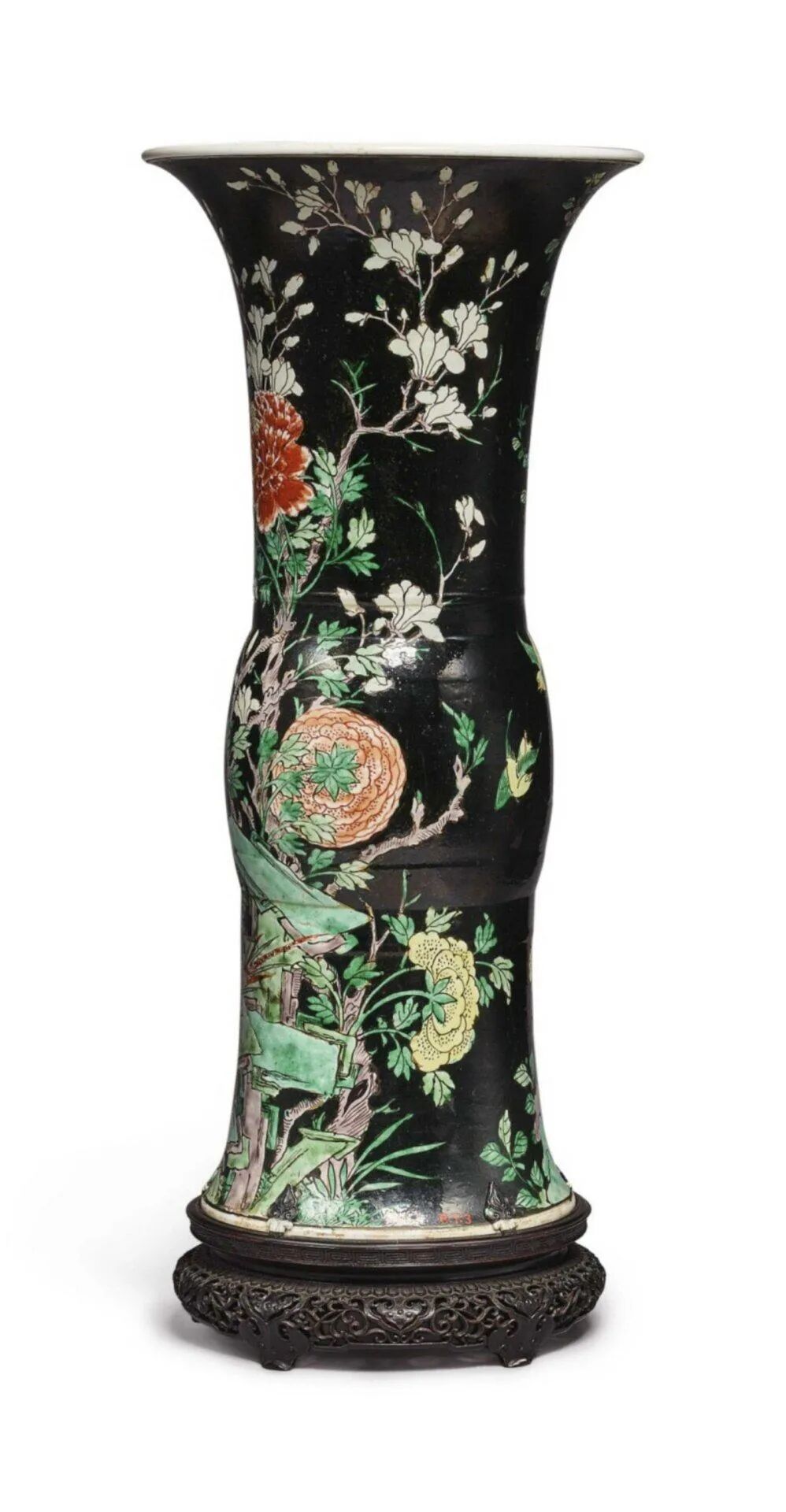 来源:苏富比纽约,2020年9月23日,重要中国艺术品,Lot 510规格:L 68.2cm,W 68.2cm,H 36cm来源:华裔企业家Kee Chiu 的遗产。购自 CHEW YING LUNG & CO., 738 Sacramento ST, San Francisco, CA。来源:乔治亚州罗马 Mike Gaither(1943 - 2021)藏品。来源:西弗吉尼亚州费尔蒙特市内 FAIRMONT FARMS MANSION 庄园规格:每只 H 46" x W 24-1/2" x D 18"来源:苏富比纽约,2020年9月23日,重要中国艺术品,Lot662Lot 384 清十八世纪 后加彩墨地五彩锦堂富贵图花觚