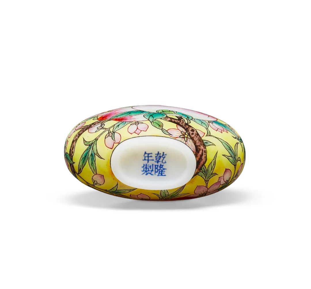 Zhang Zhongyin (1889年生) 珍藏, 上海伦敦, Robert Hall,“The Art of an Imperial Addiction”, 1995年6月21日Robert Hall, 《The Art of an Imperial Addiction》, 伦敦, 1995年, 页34–41, 编号5此鼻烟壶是乾隆时期玻璃胎画珐琅鼻烟壶造工最为上乘的例子之一,花鸟纹细节描绘得栩栩如生。自十八世纪时起,宫廷官办作坊烧造珐琅彩的技艺已达纯火炉青,此件鼻烟壶即是其巧究工艺的最佳证明。较金属胎及瓷胎而言,于玻璃胎上画珐琅对火候、温度控制更加严格,因此玻璃胎画珐琅鼻烟壶例子显得尤为珍罕。近似例可参考台北国立故宫博物院馆藏一件,载录于《故宫鼻烟壶》, 台北, 1991年, 页107。![]()