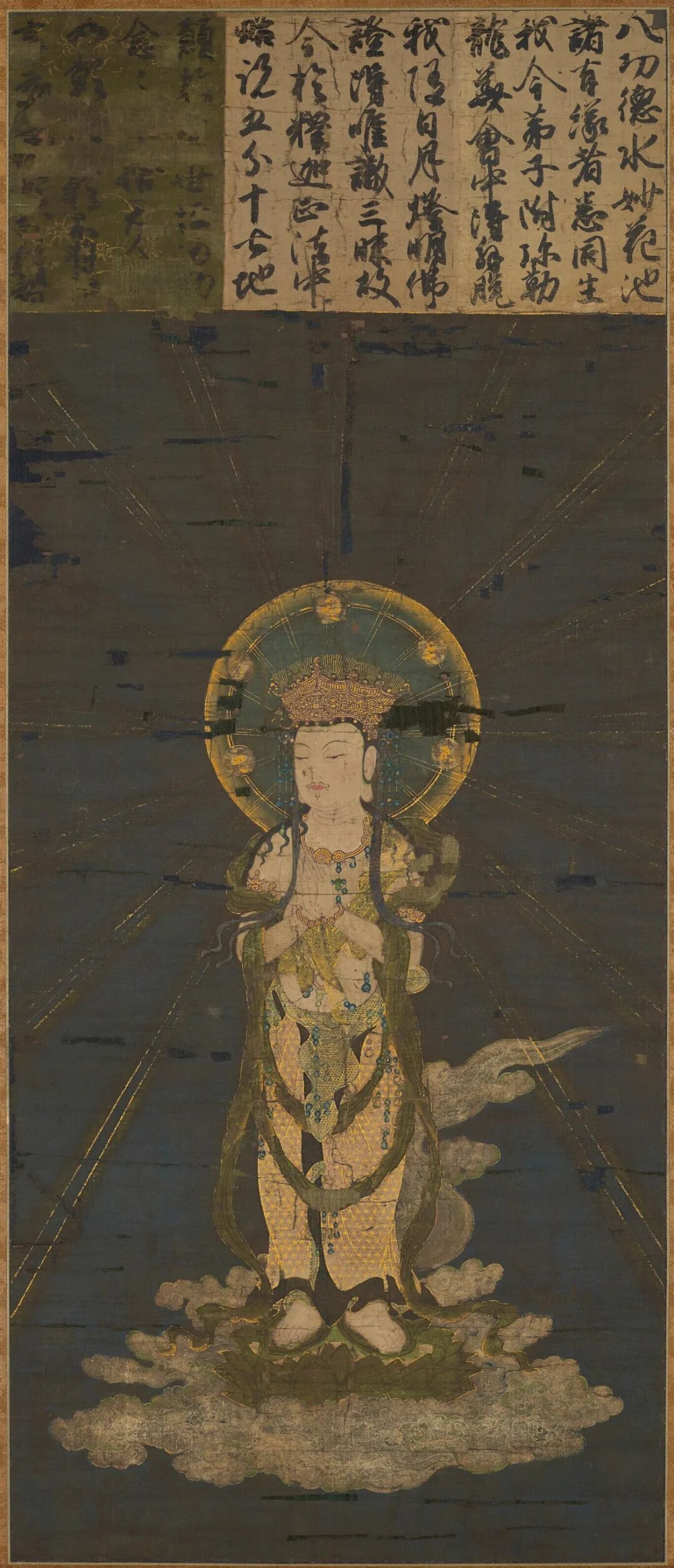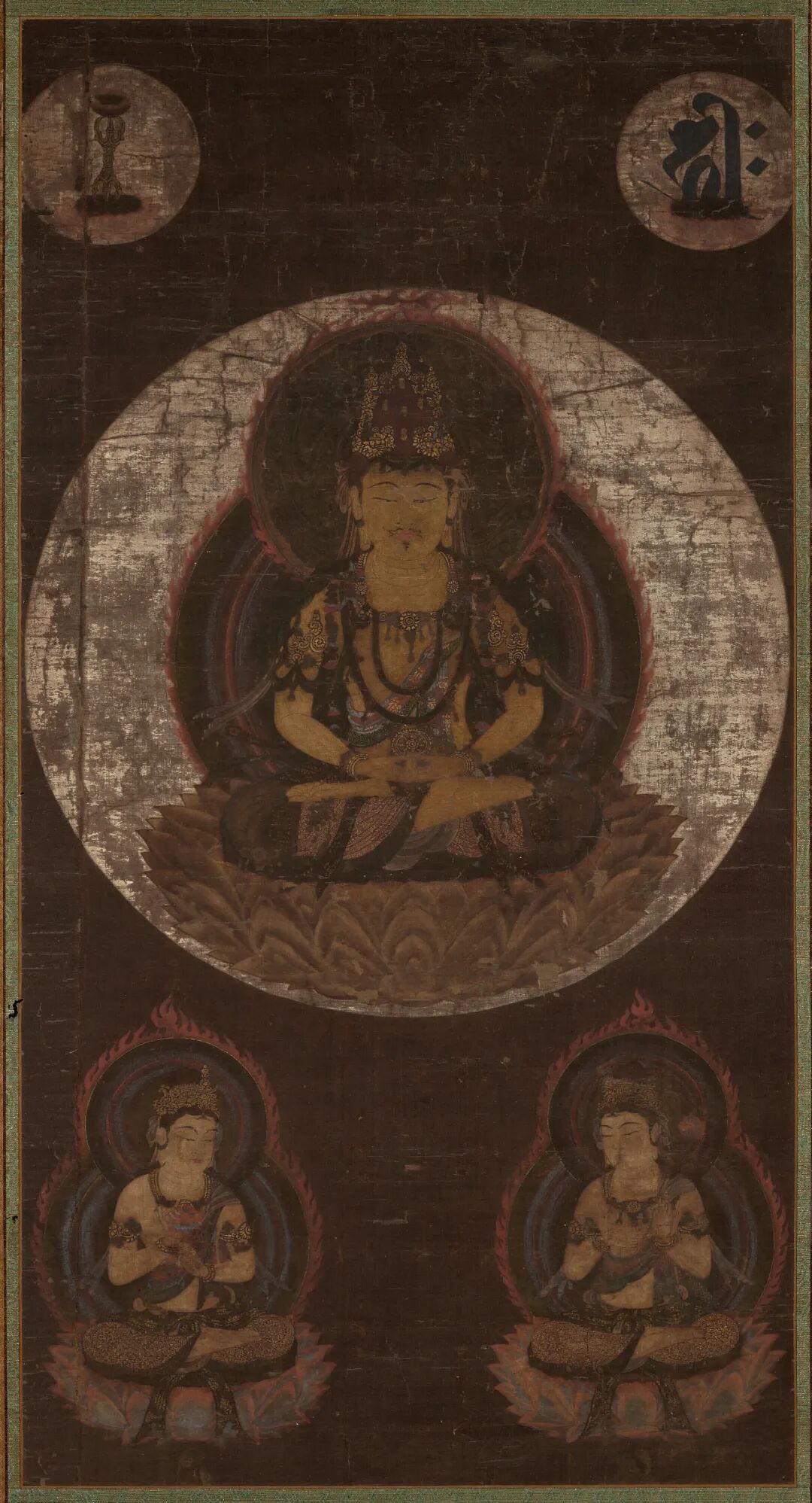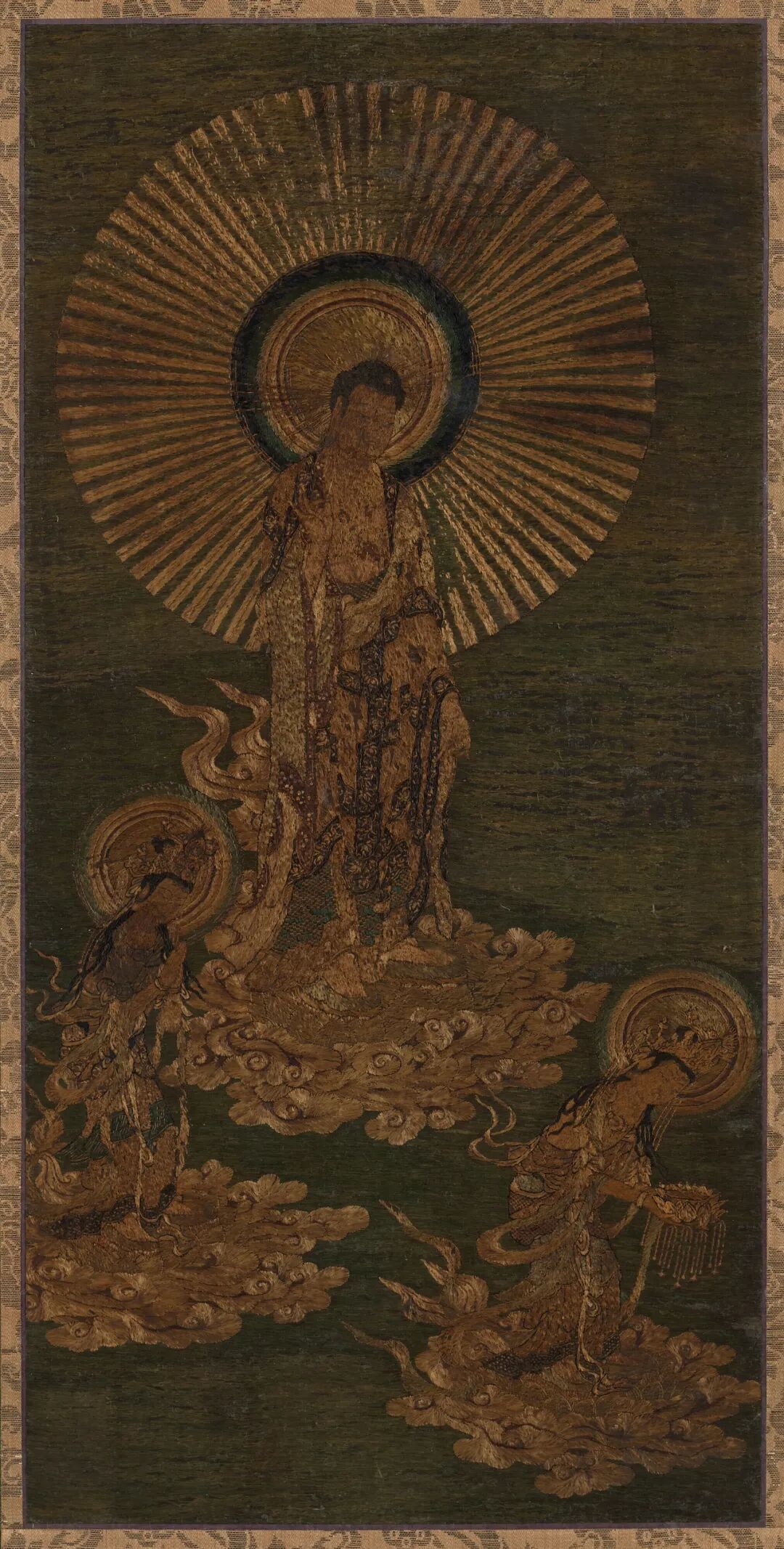 在镰仓时期的日本,以往生阿弥陀佛西方极乐净土为目标的修行被普及,而颇多小尺幅刺绣作品也为了小型私人仪式相应而生。人们通常会在绸缎中混入信者的发丝,此举被认为可保佑信者能在净土安全地重生。