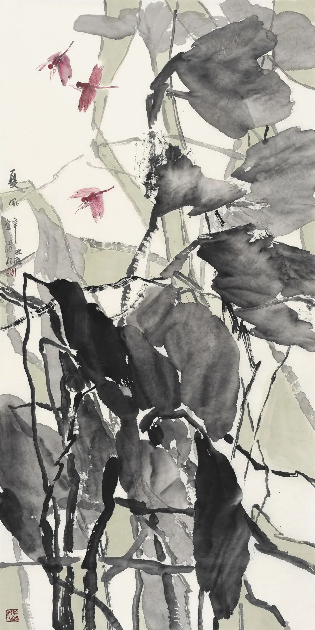 反规矩,反传统,是乔宜男中国画艺术语言上获得更大可能的一种推力,但这恰恰也是他对于规矩,对于传统有深刻的理解和把控的结果,否则,他想反也无从下手。乔宜男在他早期的工笔花鸟画中,就显示出他对于艺术造型和中国传统花鸟画艺术语言的全面和深刻把握,甚至,他的那些画于上世纪90年代的工笔花鸟画,今天看来依然是有新意的,是超前的。一直以来,他以观念、以精神、以意境、以格调来统摄画面,而不是停留在描写、叙述等层面上,所以他自然与现当代花鸟画中往往迷恋再现式的通病截然不同。他的画以善于营造意境、营造氛围的整体来感染观者,观者在他的画前或悲或喜,或惆怅或释然,总是会有莫名的情愫而生,而不是斤斤于画面上具体可辨的某石某树、某鱼某鸟。所以他的艺术语言方式看似离经叛道,看似是“去艺术”、“反传统”,实际上,所谓艺术,肇始于自然,亦以自然为最高境界,故有云“道法自然”,艺术贵在天然去雕饰。依此而论,乔宜男在其艺术的突破实则与六祖“撕经骂佛”之举一样,他是在直指关键,直奔艺术而来的。他的花鸟画越过了中国画文人画传统以及20世纪融合写实画法、现实主义画法的新传统,实现了水墨写意花鸟画从古典形态向现代形态的转换。