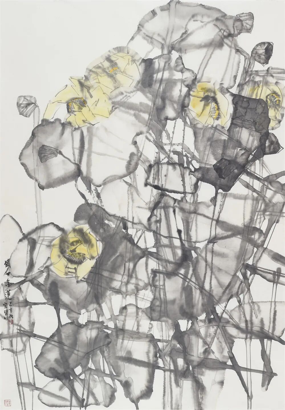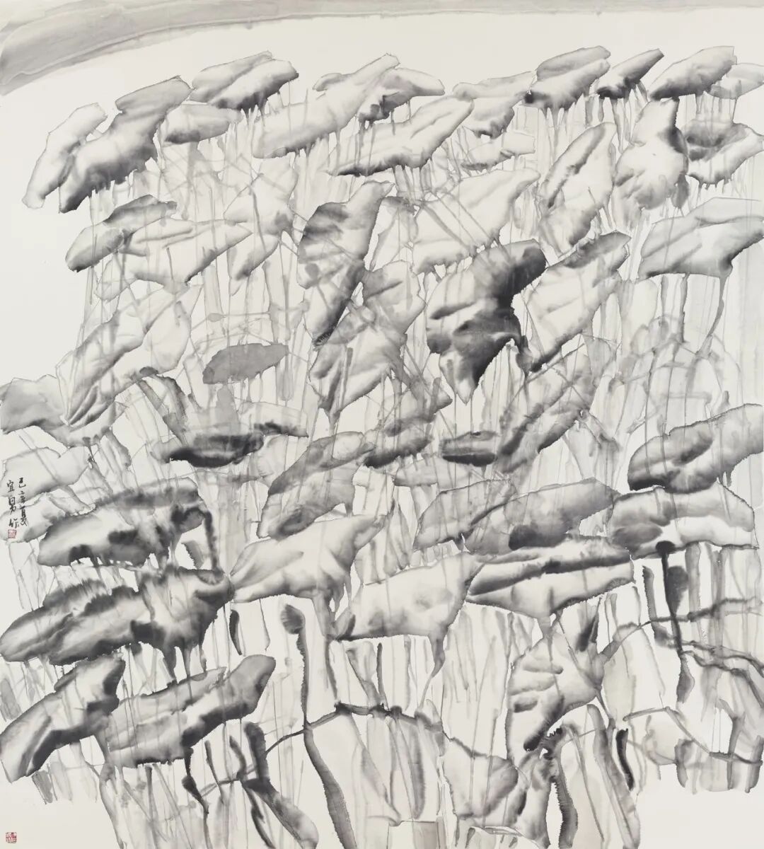 除了乱笔散线之创造,在艺术语言上,他的渍墨法也值得关注。他的画面乍看是用的大泼墨法,水墨淋漓,但实际上收放有度,是有节制的生发,不是泛滥无度,这与他善于渍墨法不无关系。他善于用水,水破墨,墨破水,形成一种有控制的泼墨效果,画面上水墨淋漓,氤氲多韵,而在墨晕的边缘则形成如屋漏痕般边缘线。以乱笔散锋存形,以渍墨生韵,锐利的线与随形的墨块形成的交错之美,透明的墨块与墨块透叠出的斑驳之美,“如琉璃的光影,如烛光下水晶餐具的交错幻化。”