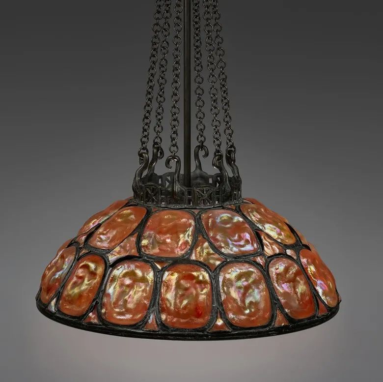 "龟背 "吊灯,蒂芙尼工作室设计,约1915年制,含法夫莱尔玻璃、棕锈青铜,高 38 cm.,灯罩直径 68 cm.。估价︰150,000 - 250,000 美元。此作将于12月10日佳士得纽约 “蒂芙尼” 拍卖中呈献