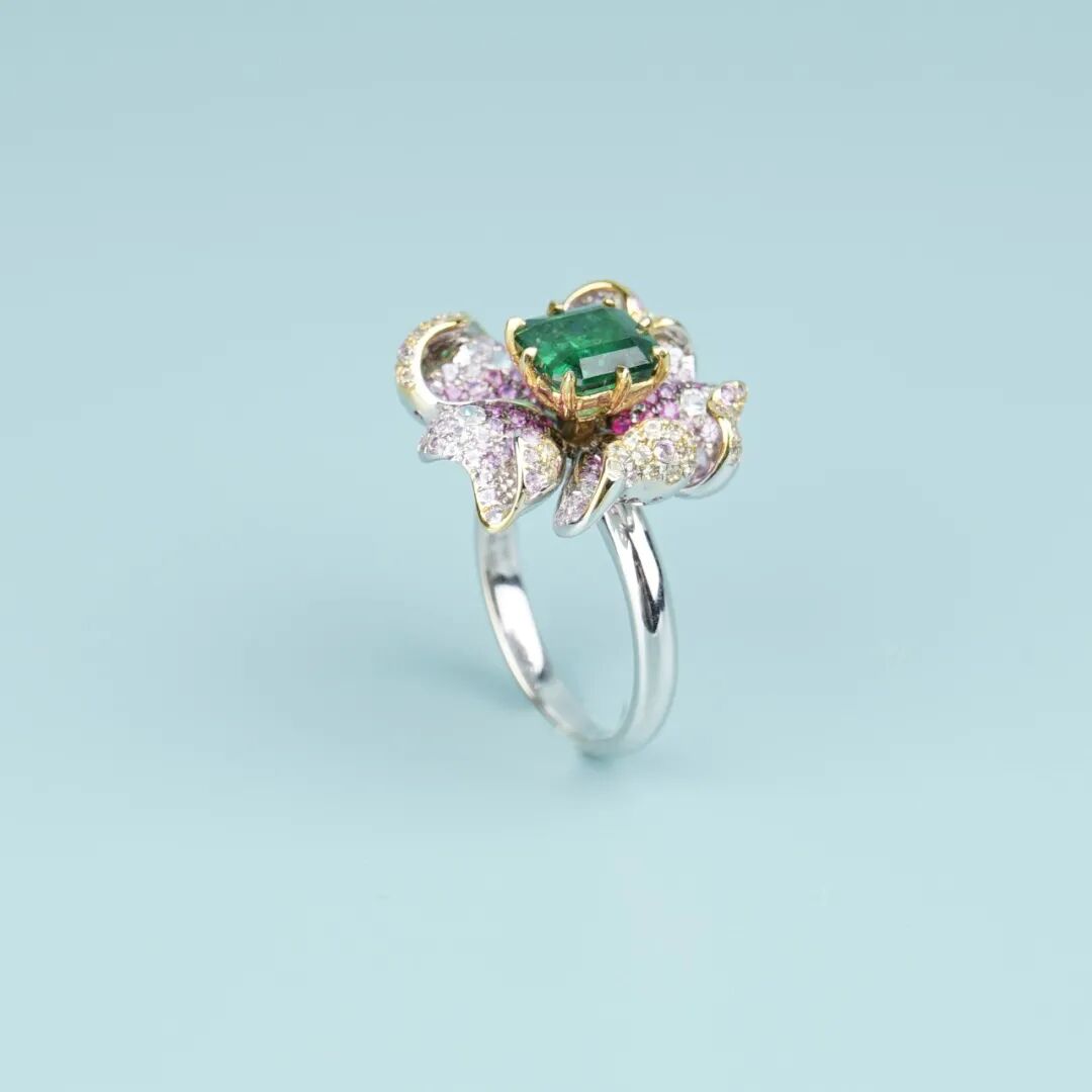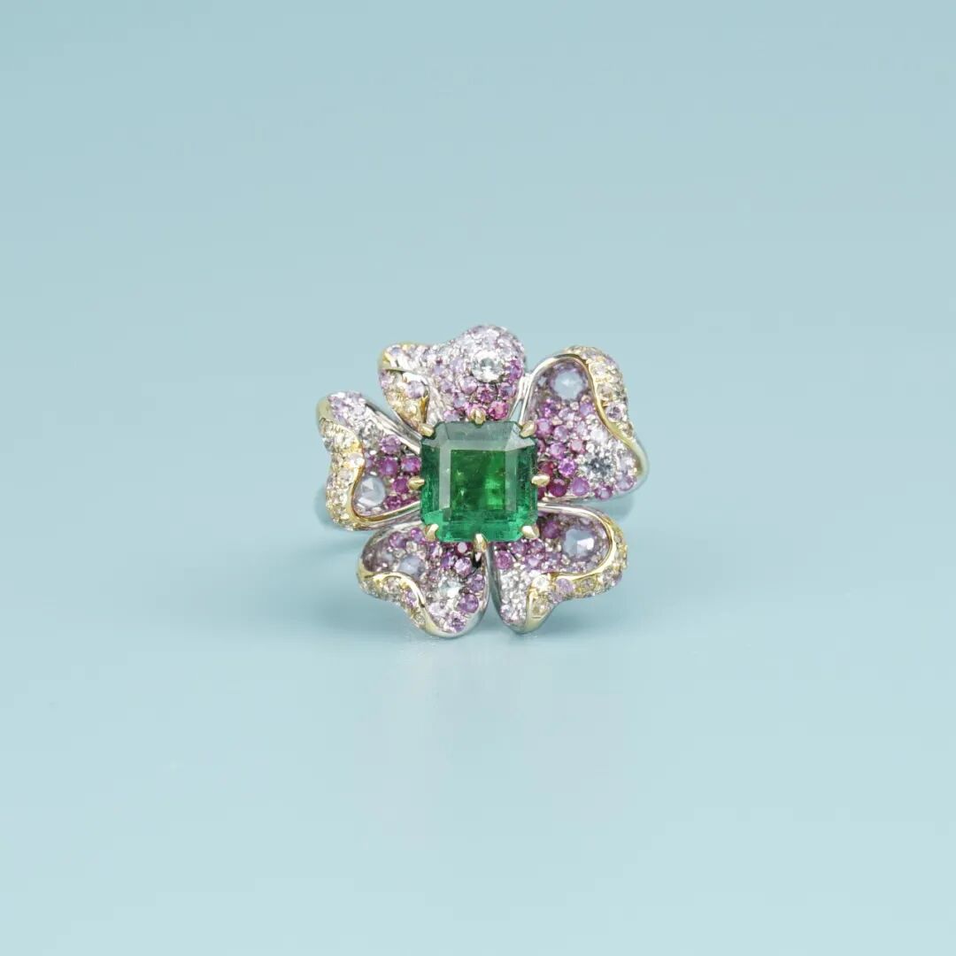 1.57克拉天然祖母绿配粉色蓝宝石花卉造型戒指