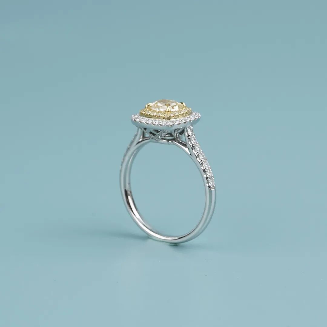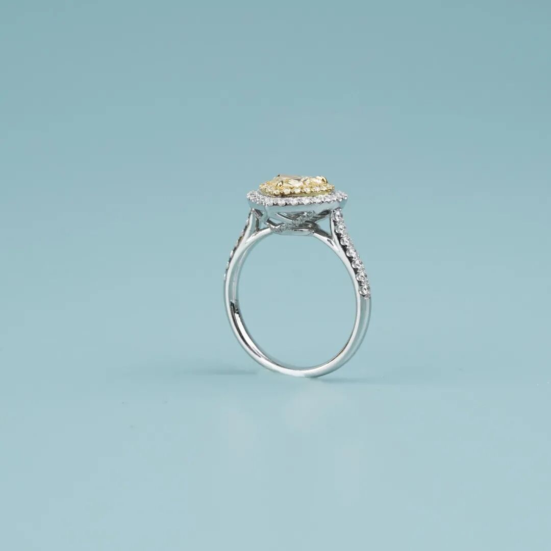 18k白金镶嵌天然钻石,枕垫型切割,主石共重约1.02克拉,颜色为彩黄色(Fancy Yellow),配镶钻石共重约0.48克拉。