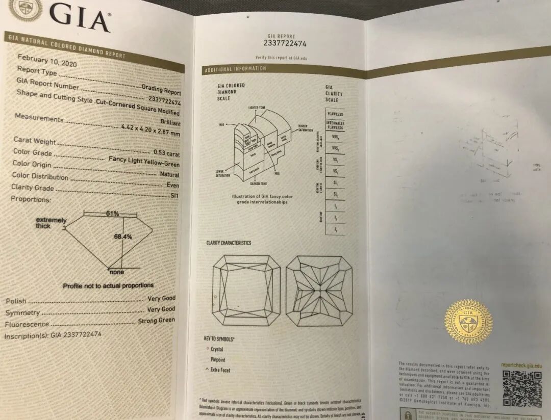 18k白金镶嵌天然钻石,切角方型异型切割,设计为花卉形态,主石共重约0.53克拉,颜色为淡彩黄绿色(Fancy Light Yellow-Green),配镶钻石共重约0.52克拉。