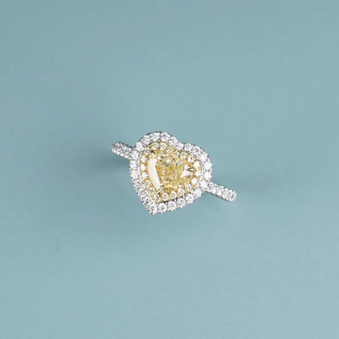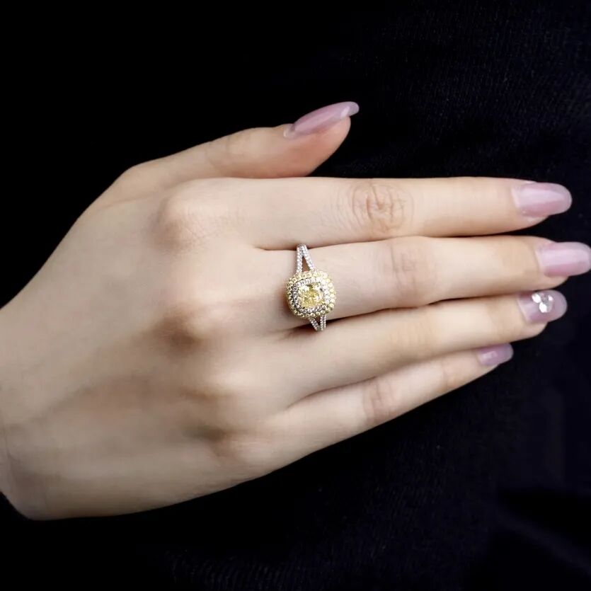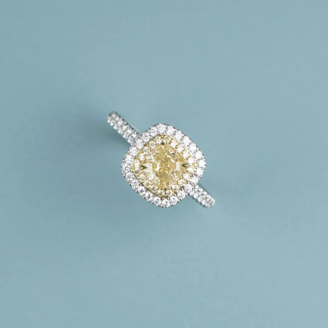 1.01克拉枕垫型天然黄色钻石配钻石戒指