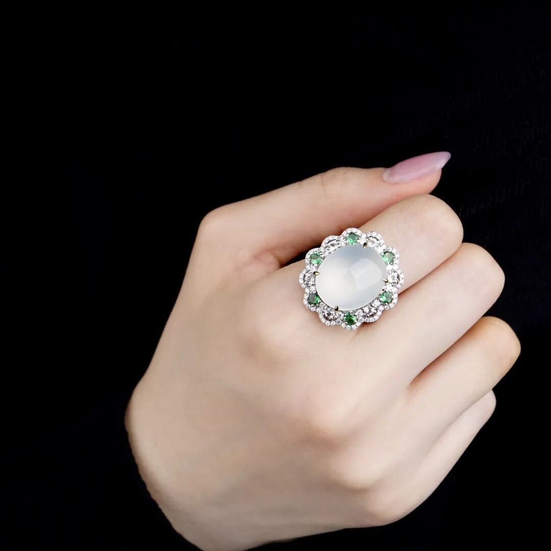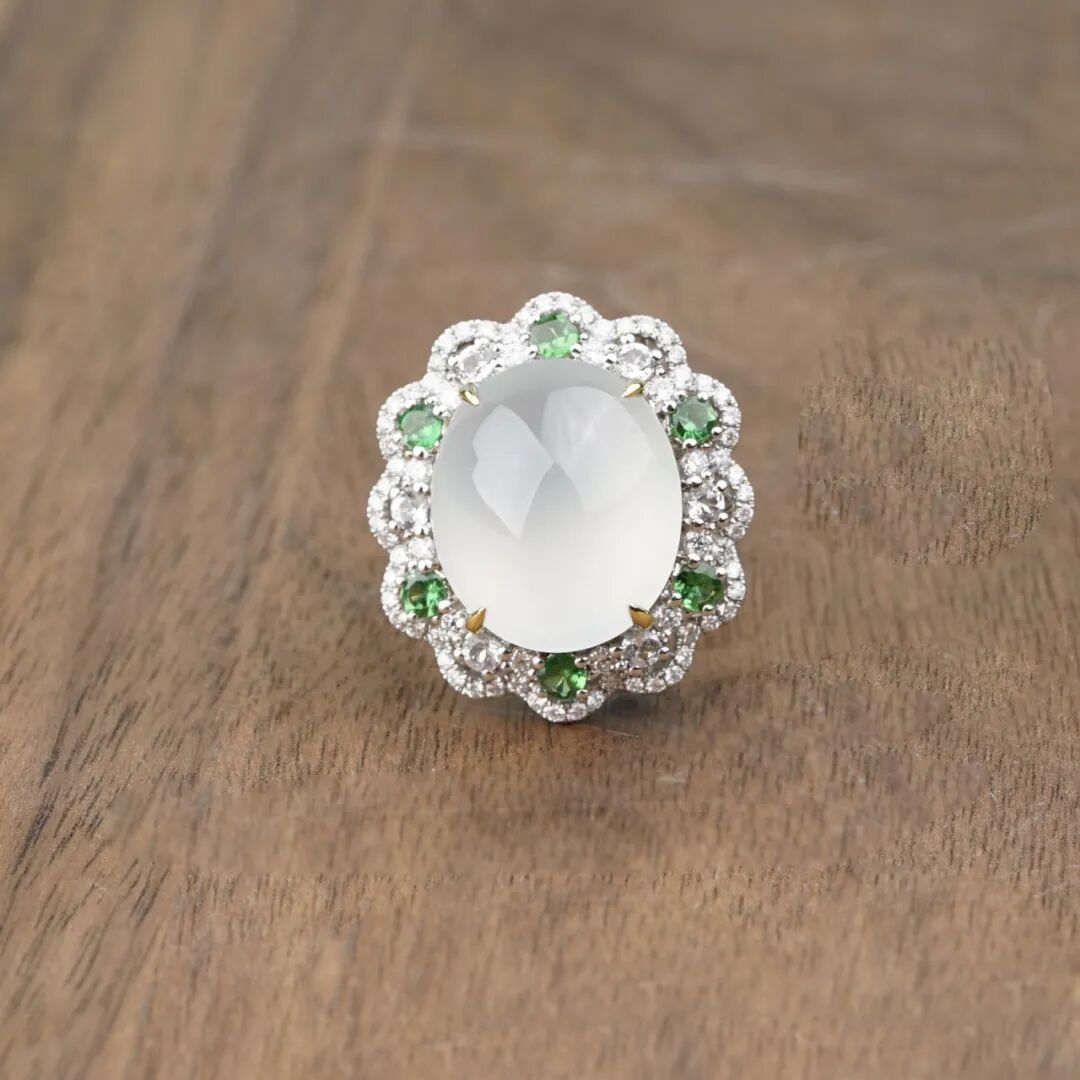 天然翡翠蛋面配钻石及沙弗莱戒指