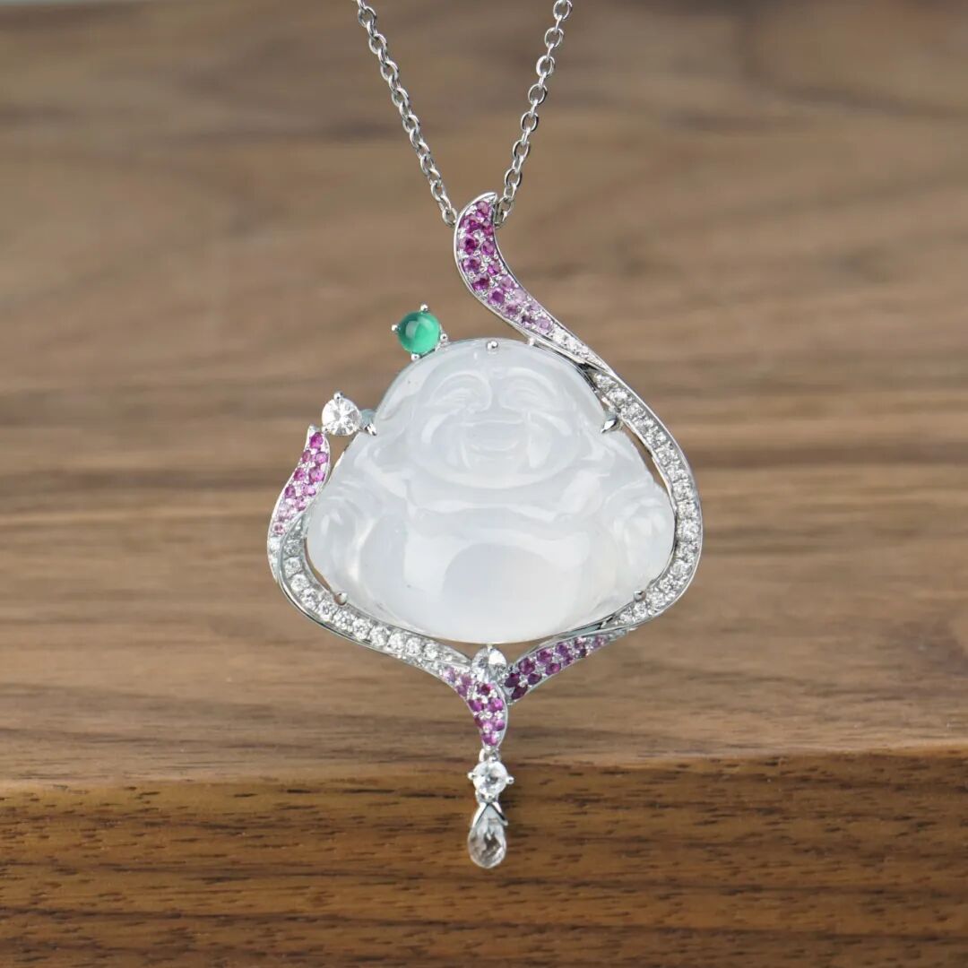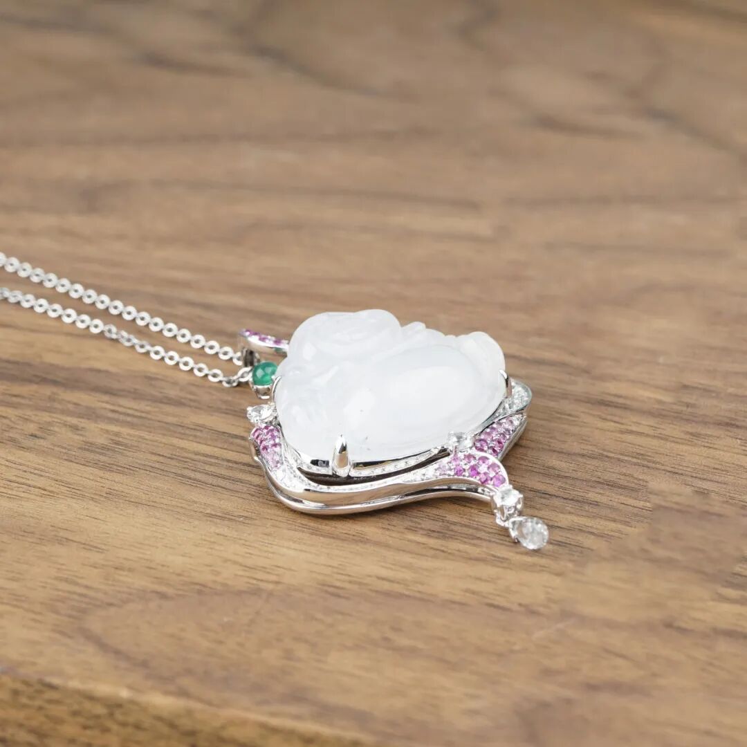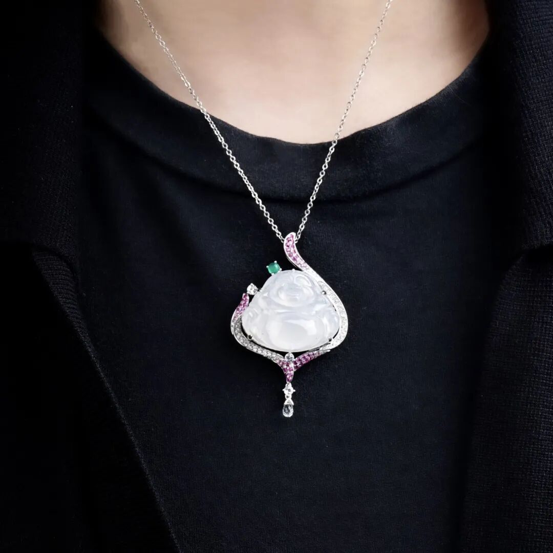 18K白金镶嵌天然翡翠佛公,翡翠饱满莹润,配镶钻石、粉色蓝宝石及翡翠点缀,配镶钻石共重约克拉0.32。