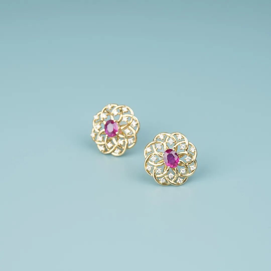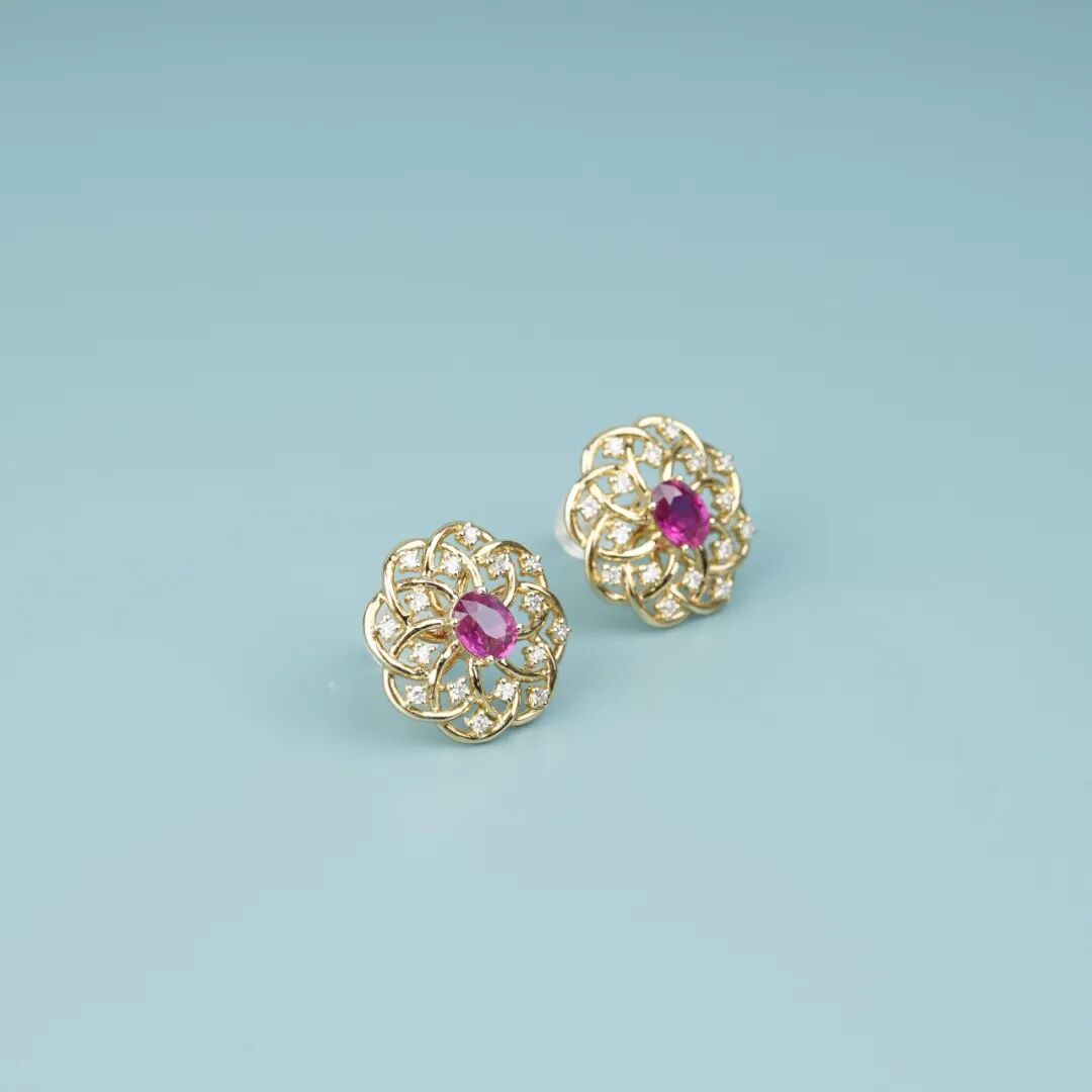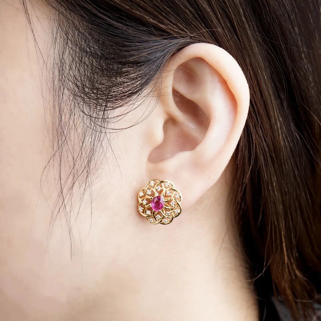 18k黄金镶红宝石耳钉,红宝石共重约1.2克拉,未经加热,配镶钻石共重约0.32克拉。
