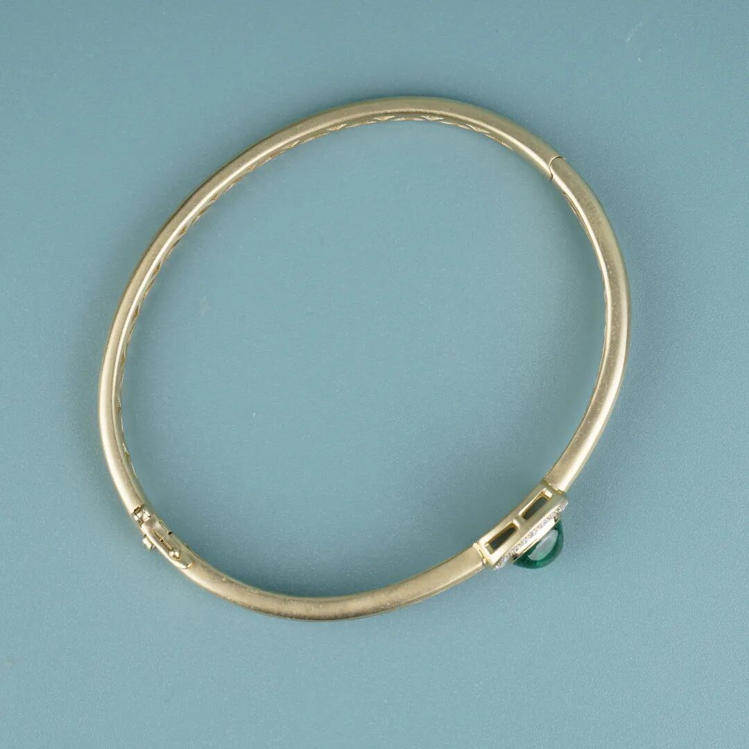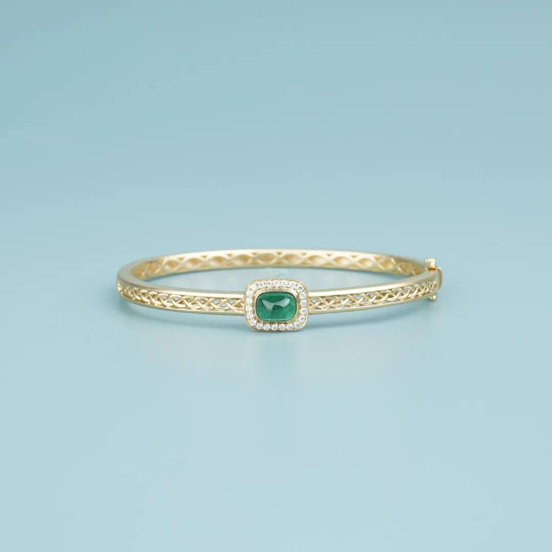 18k祖母绿手镯,祖母绿共重约0.85克拉,颜色为Vivid Green,指为木佐绿,配镶钻石共重约0.18克拉。哑光磨砂工艺。