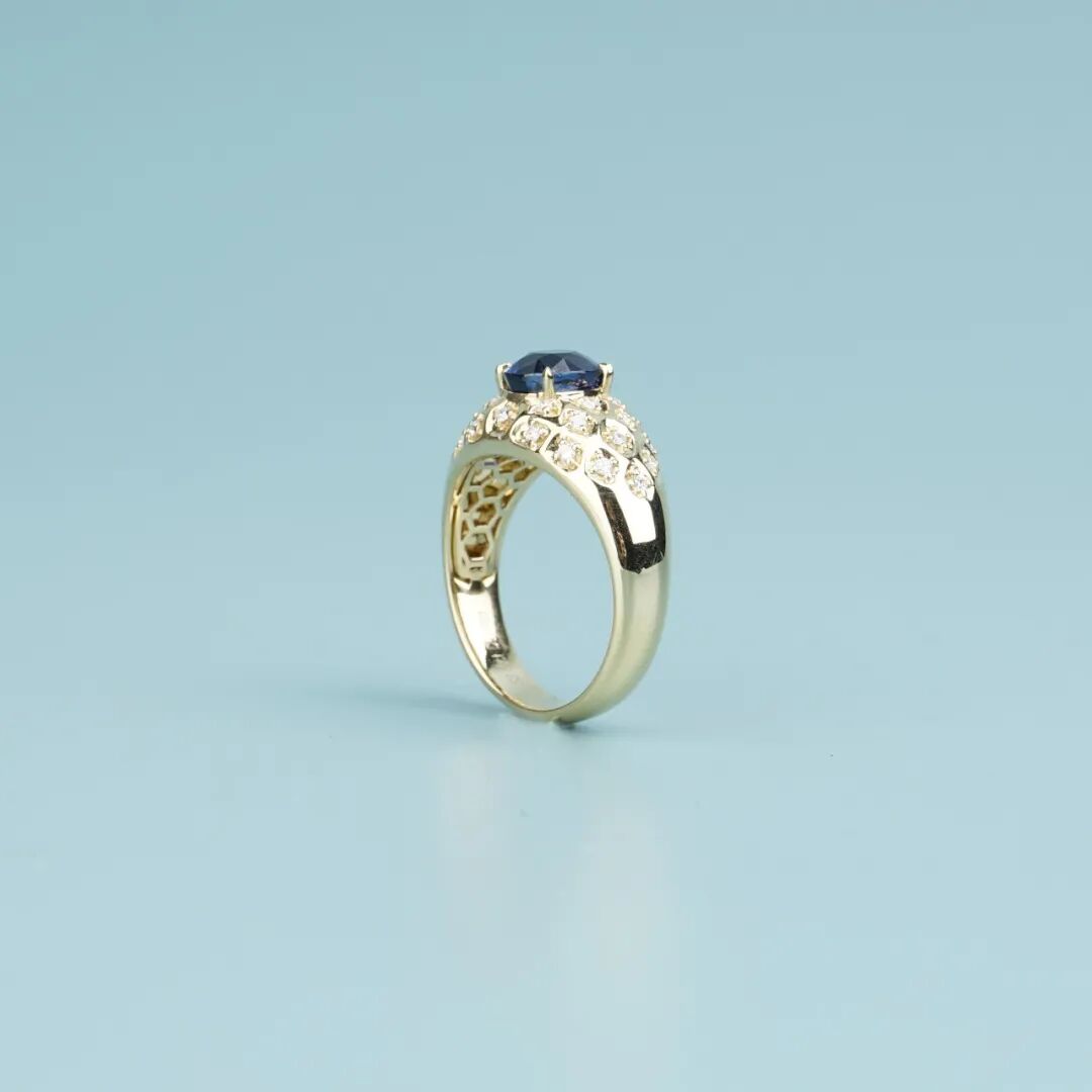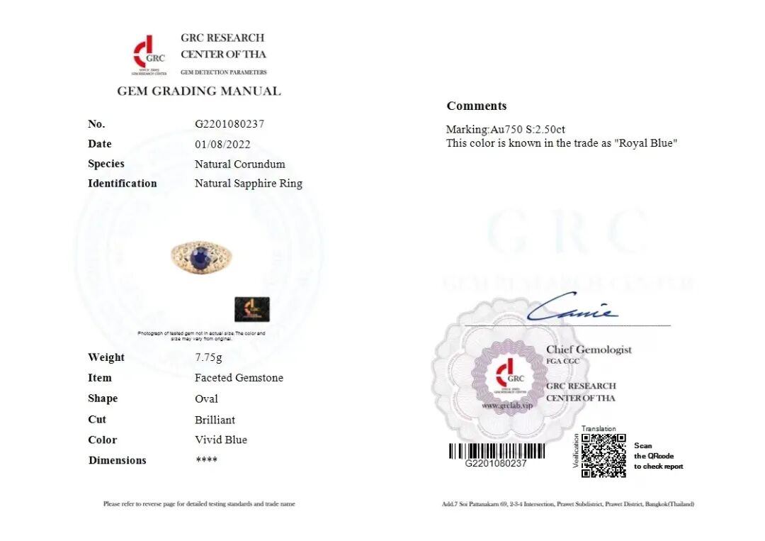 18k蓝宝石戒指,蓝宝石共重约2.5克拉,颜色为Vivid Blue,指为皇家蓝,配镶钻石共重约0.28克拉。
