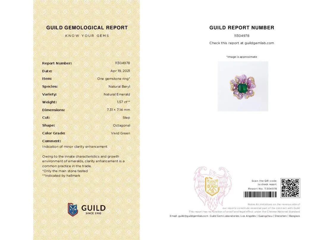 18k白/黄金祖母绿戒指,祖母绿共重约1.57克拉,颜色为Vivid Green,微油,配镶粉色蓝宝石共重约2.14克拉。
