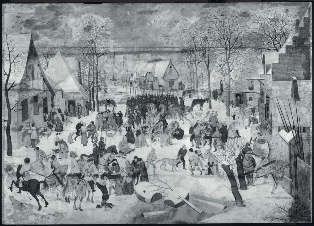 虽然大屠杀的主题取自马太福音,但勃鲁盖尔将叙事置于他当时的生活背景下。他将伯利恒想象成一座那个年代的被雪覆盖的荷兰村庄,而无辜者的盛宴将在12月28日举行。洛恩·坎贝尔(Lorne Campbell)认为,如果勃鲁盖尔没有经历过1564-5年异常寒冷的冬天,他就无法用自然主义描绘出冰冻的场景。同时期,也许并非巧合,勃鲁盖尔开始绘制雪景,例如,《雪中猎人》(维也纳,艺术史博物馆)和《冬季风景与捕鸟器》(布鲁塞尔,美术博物馆),两者均为1565年所绘; 1566年《伯利恒的人口普查》(布鲁塞尔,Musée des Beaux-Arts); 和1567年《冬景中的贤士崇拜》(Winterthur,Oskar Reinhart Am Rmerholz 收藏)。
