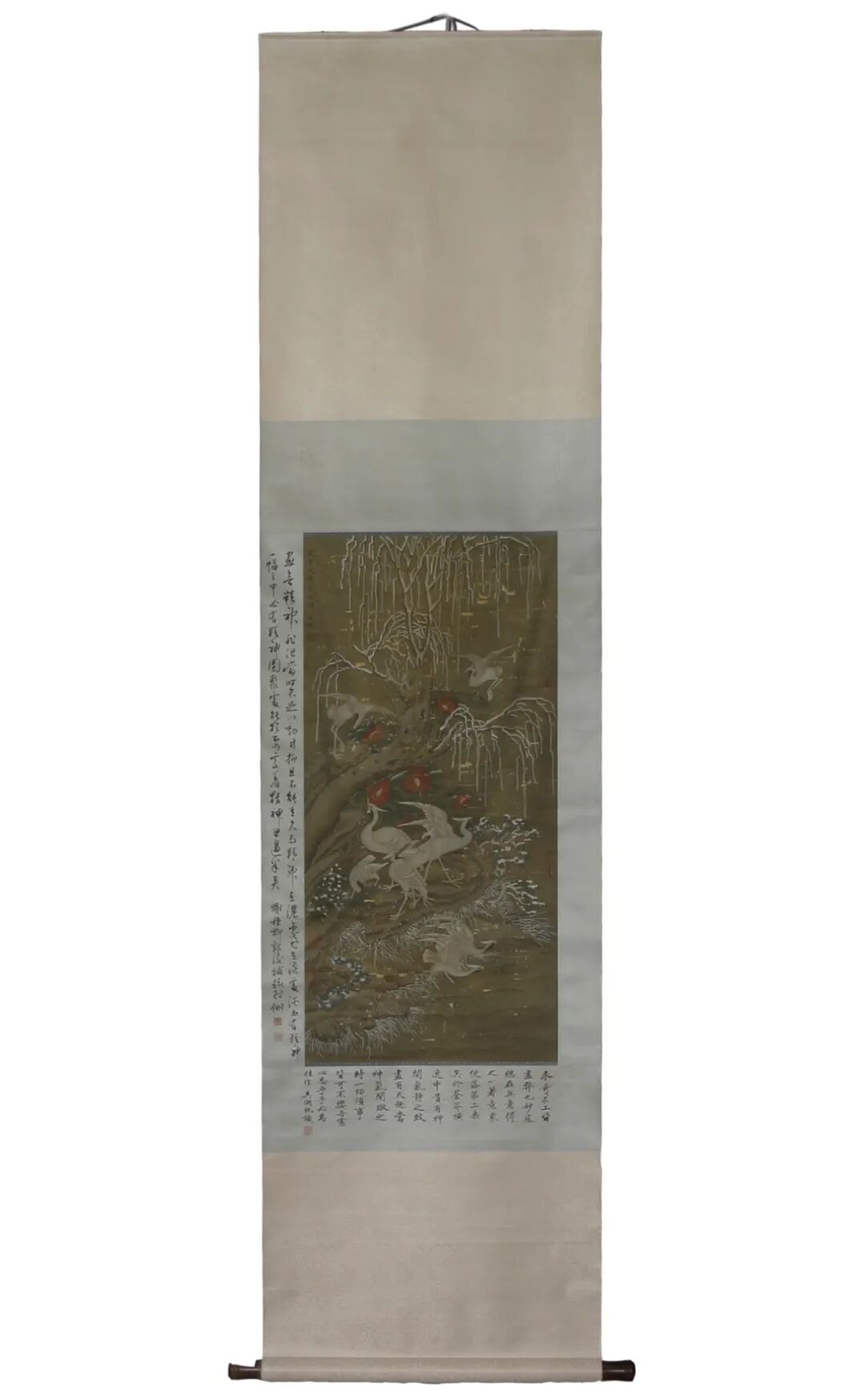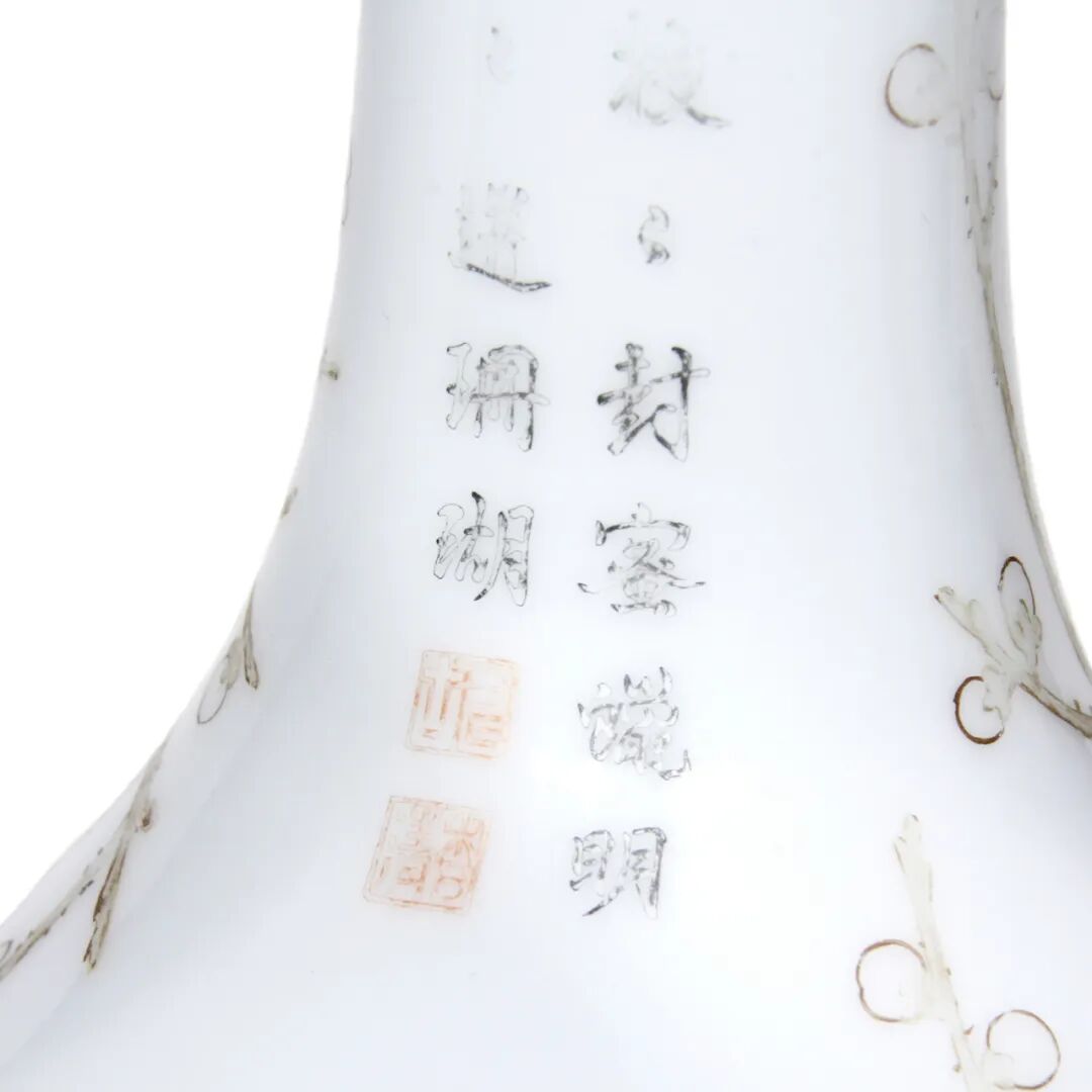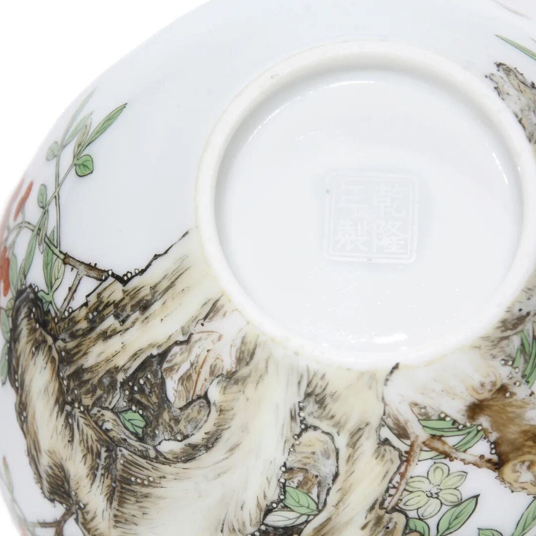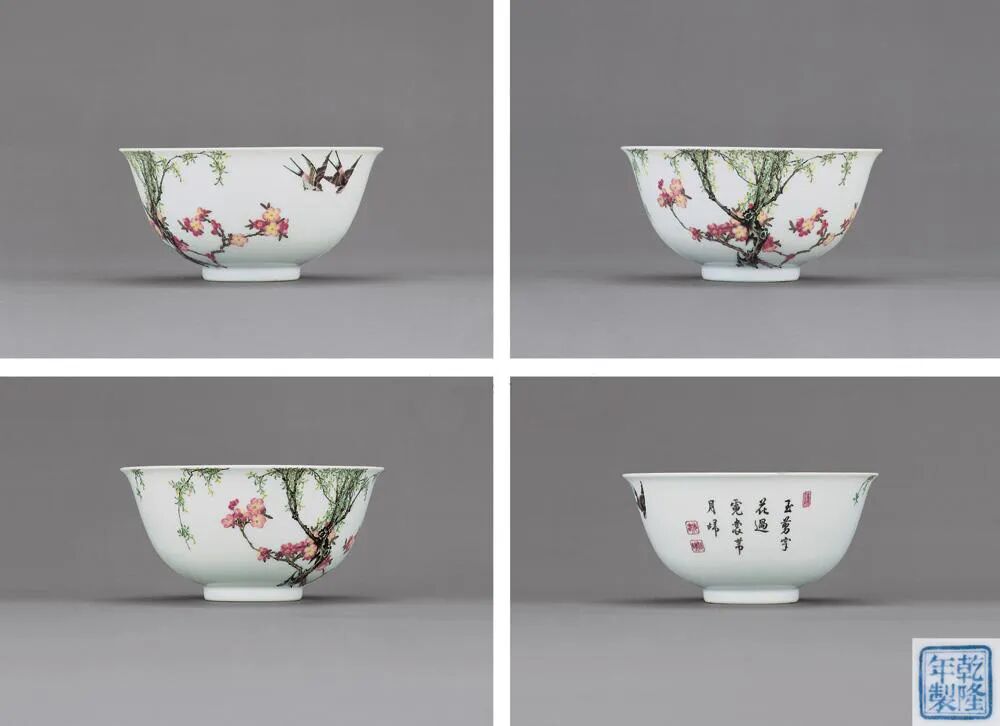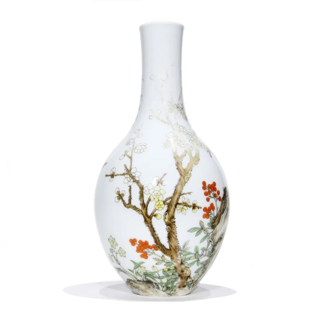 高 20.5 cm;口径 3.5 cm;足径 4.5 cm这胆瓶上的幅画设计采用传统风格,并与当时的诗句相结合。这首诗题识是:“ 素萼枝枝封蜜蜡,明珠颗颗迸珊瑚 ”及三方小印是只出现于造半处珐琅彩器之上。类似的例子在台北故宫博物院或北京的收藏中也有发现。其珍贵程度可见一斑。瓶形名为“胆瓶”,造型典雅精致。具有这种轮廓的物体被视为精神物体,是纯洁的代名词。颈部笔直而修长,肩部和腹部呈圆形。此外,它的外形与瓶子相似,并因与胆囊相似而得名。如此高质量的瓷器,一般是景德镇御窑的陶工做瓷器,紫禁城内的作坊来做珐琅装饰。是用精致和精细的笔触制作的。瓷画与宫廷画相近,中西艺术家在珐琅作坊中作画。由年代和使用的原因,珐琅彩部分磨损在颈部及底部款识 “乾隆年制”正方形四字的彩以没有。款识标记是在釉下制作的。可以看到的两点是由当时使款制作居中的目的, 然后在被珐琅彩覆盖,现珐琅彩随着于岁月的痕迹而消失。这类型的作品非常罕见,是保存在世界上最精选的收藏中。高 4.2 cm;口径 16.8 cm;足径 11 cm高 5.5 cm;口径 13.6 cm;足径 4.7 cm高 22.5 cm;口径 8 cm;足径 8.5 cm28 x 13.5 x 13 cm;口径 9 cm;足径 11.2 cm高 10 cm;嘴把尺寸 17.2 cm;口径 8 cm;足径 9 cm高 24.5cm;口径 7.5 cm;足径 7.5 cm高 19.5 cm;口径 9.8 cm;足径 7.7 cm高 11.5 cm;口径 3cm;足径 5.8 cm高 6.5 cm;口径 12.7 cm;足径 6.5 cm丝绘画尺寸 86 x 39 cm;总尺寸 218 x 52 cm高 7.4 cm;口径 22 cm;足径 8 cm