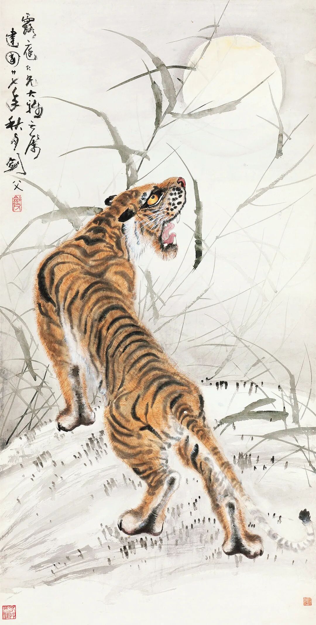 嶺南「折衷中外,融合古今」的高劍父既是同盟會成員,積極參與孫中山領導下的革命戰爭;又是求創新,提倡寫生的水墨藝術家。這幅畫作於1938年,正值二戰爆發,中日激戰甚酣。畫中老虎作仰天咆哮之狀,聲響徹天;其四肢舒展,身姿挺拔,眼珠極具立體感與通透感,炯炯有神且目光堅定。藝術家通過此畫鼓舞民族士氣,誓把侵略者打敗驅趕之意。