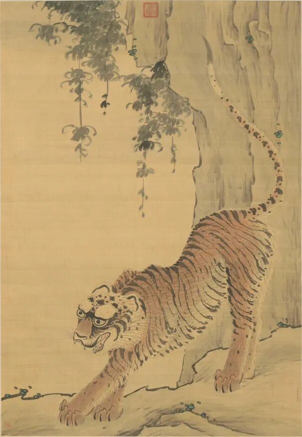 直至明清時期,繪畫中的老虎逐漸臉譜化,淪為山水畫中的配角,畫家基本沒有在現實中對虎寫生,而是通過畫譜與想像進行描繪。
