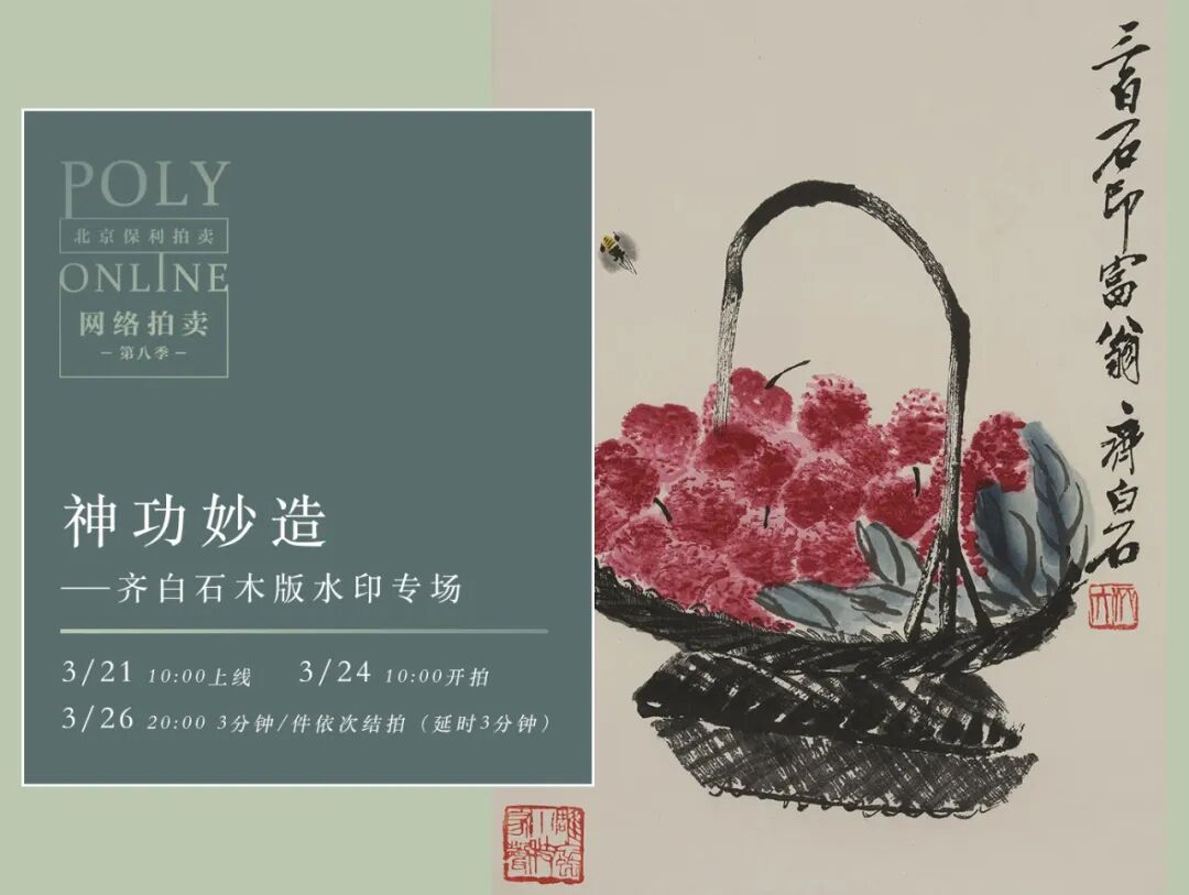 “妙笔生花蝶入神,盈怀绝技空自身。”一代代大师通过刻苦学习和钻研,将木板水印的技艺不断精深,将经典传承。此次保利古籍网拍“神功妙造—齐白石木版水印专场“集合同一藏家提供木板水印拍品三十件,可谓名品璀璨,熠熠生辉,汇成异彩。望藏家宝之爱之。