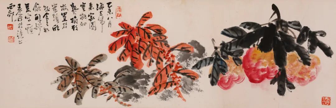 题识:己未八月海上归来,家园蜜桃初熟,摘数枚置于案头,欣然食之,如饮醇醪,爰写一帧,王个簃于沪上西郊。