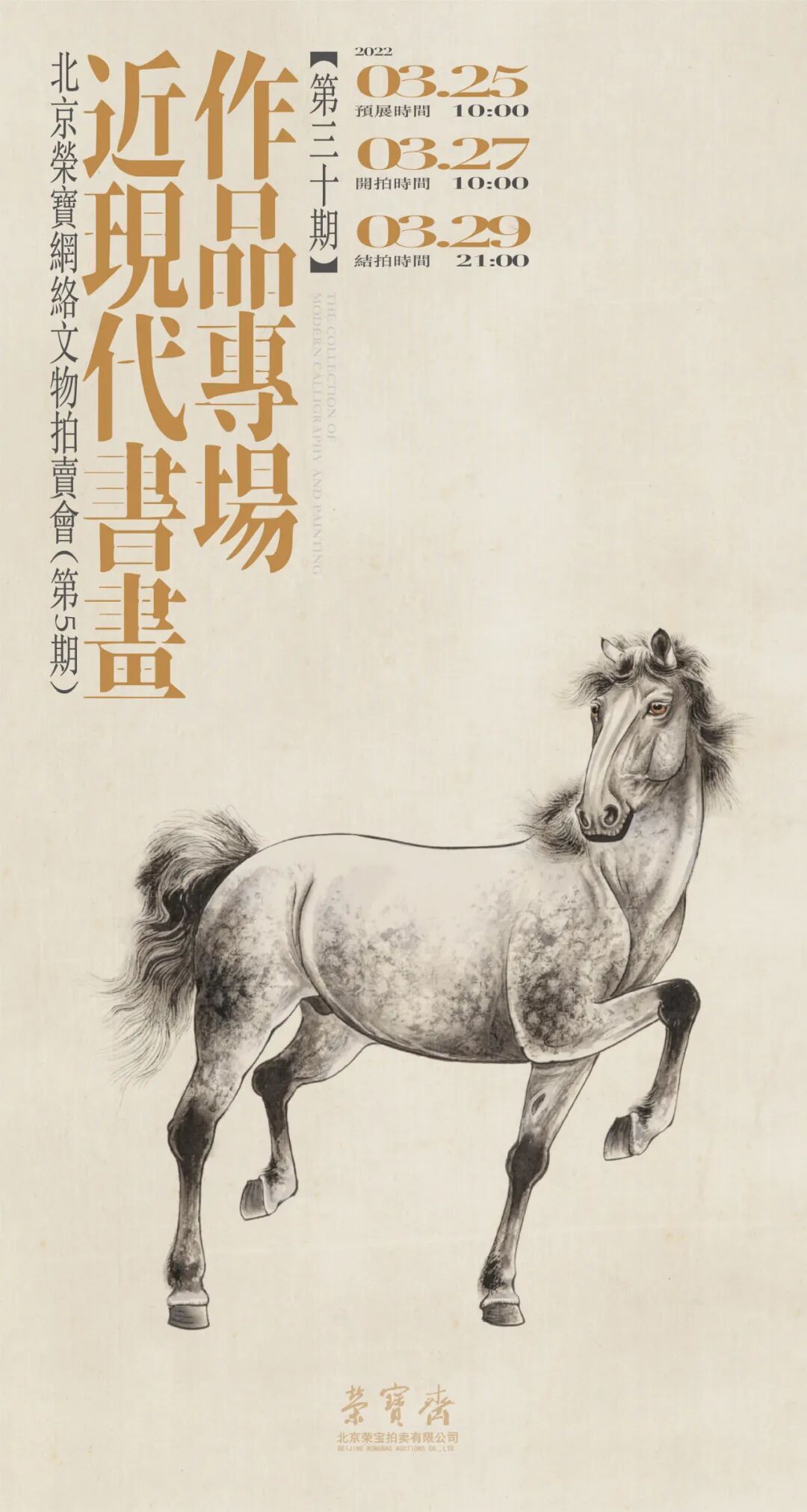 北京荣宝网络文物拍卖会(第5期)·近现代书画作品专场(第三十期)将于3月25日10:00—3月27日10:00开启线上预展,并于3月27日10:00开拍,3月29日21:00结拍。