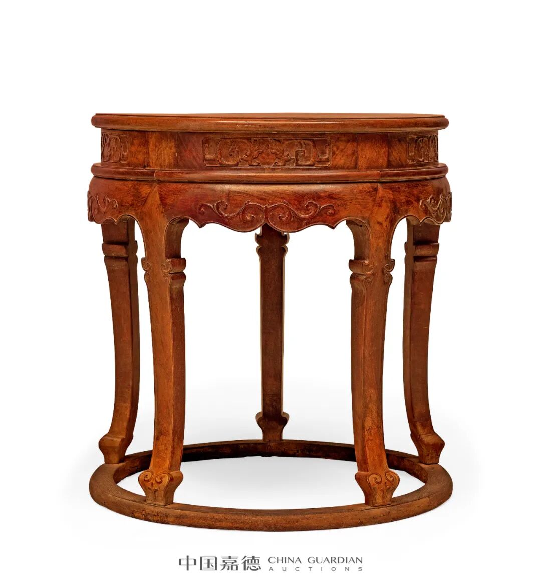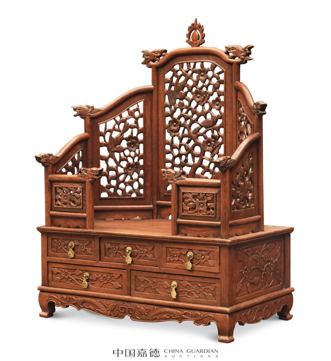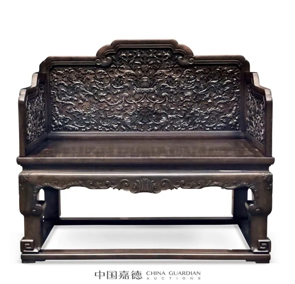 中国嘉德2011年秋拍成交的这件大名鼎鼎的紫檀雕西番莲庆寿纹宝座,铲地浮雕西番莲纹,图案为舒卷的草叶、蚌壳等,这种富丽奢华的欧洲洛可可风格,与清宫贵族气息契合。