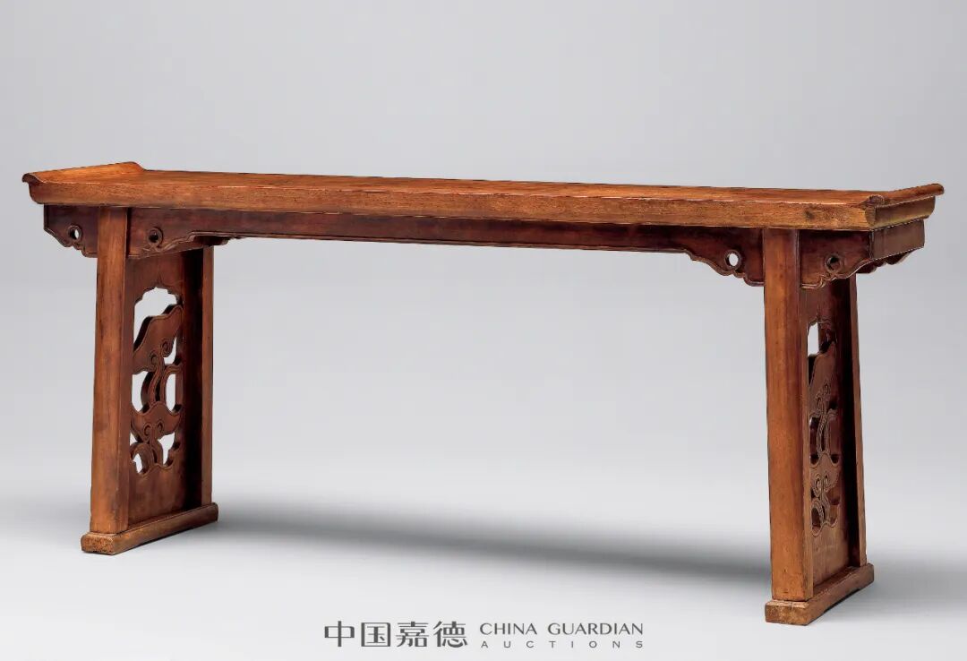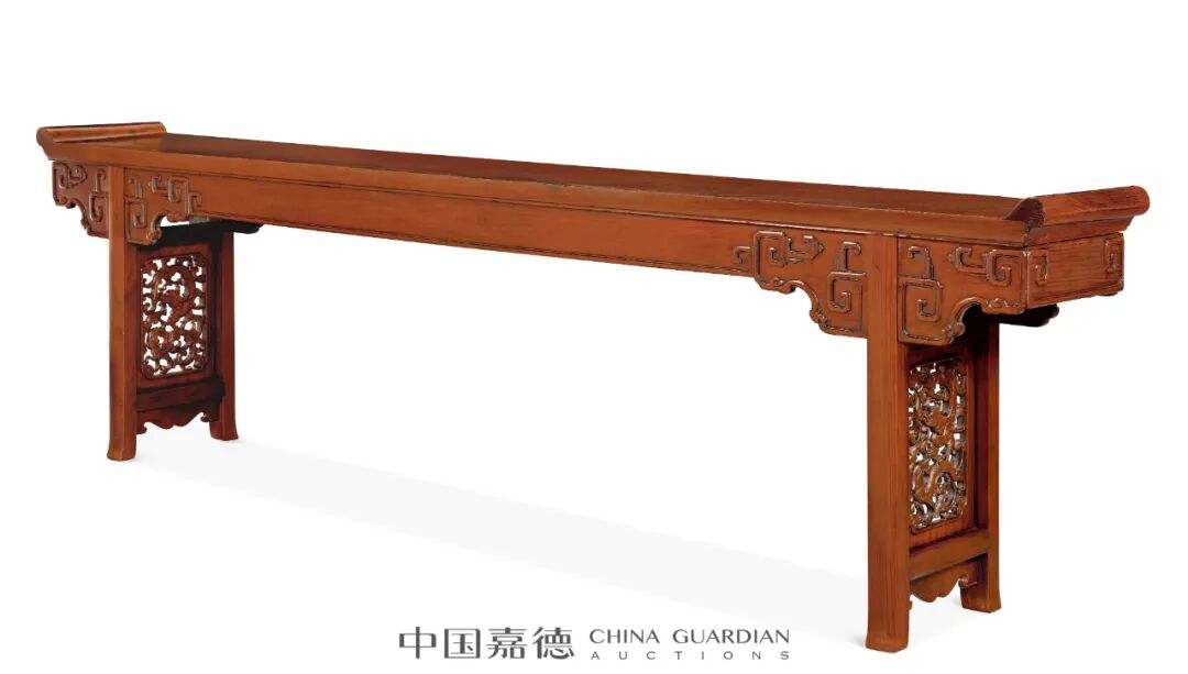 明清家具上的植物纹样运用很广泛,在案桌挡板上常见有花草浮雕纹,构图独立完整,以矩形画面为主。
