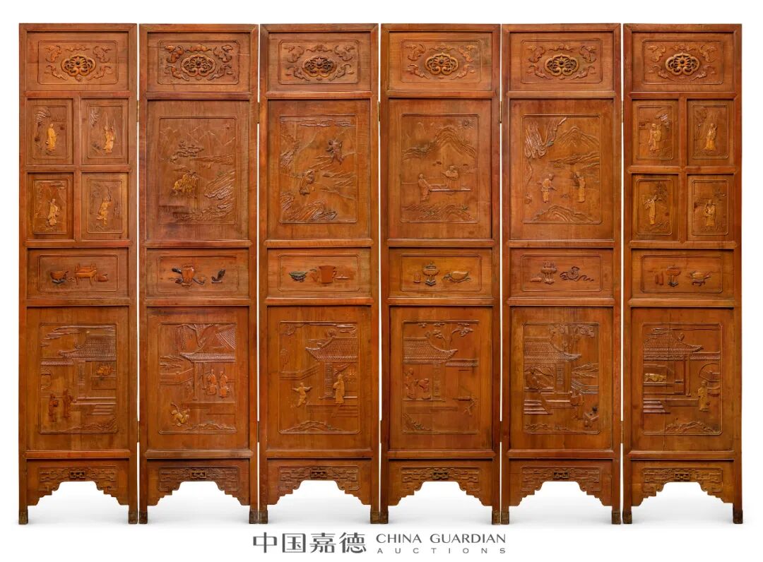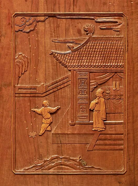 如五子夺魁是五个孩童抢夺一顶金盔,盔谐音魁,借寓考中状元。传说故事、历史典故都涉及人物,完整的纹样较大,通常以浮雕、透雕等形式出现在围屏扇、折屏、座屏、插屏等大的家具构件上。
