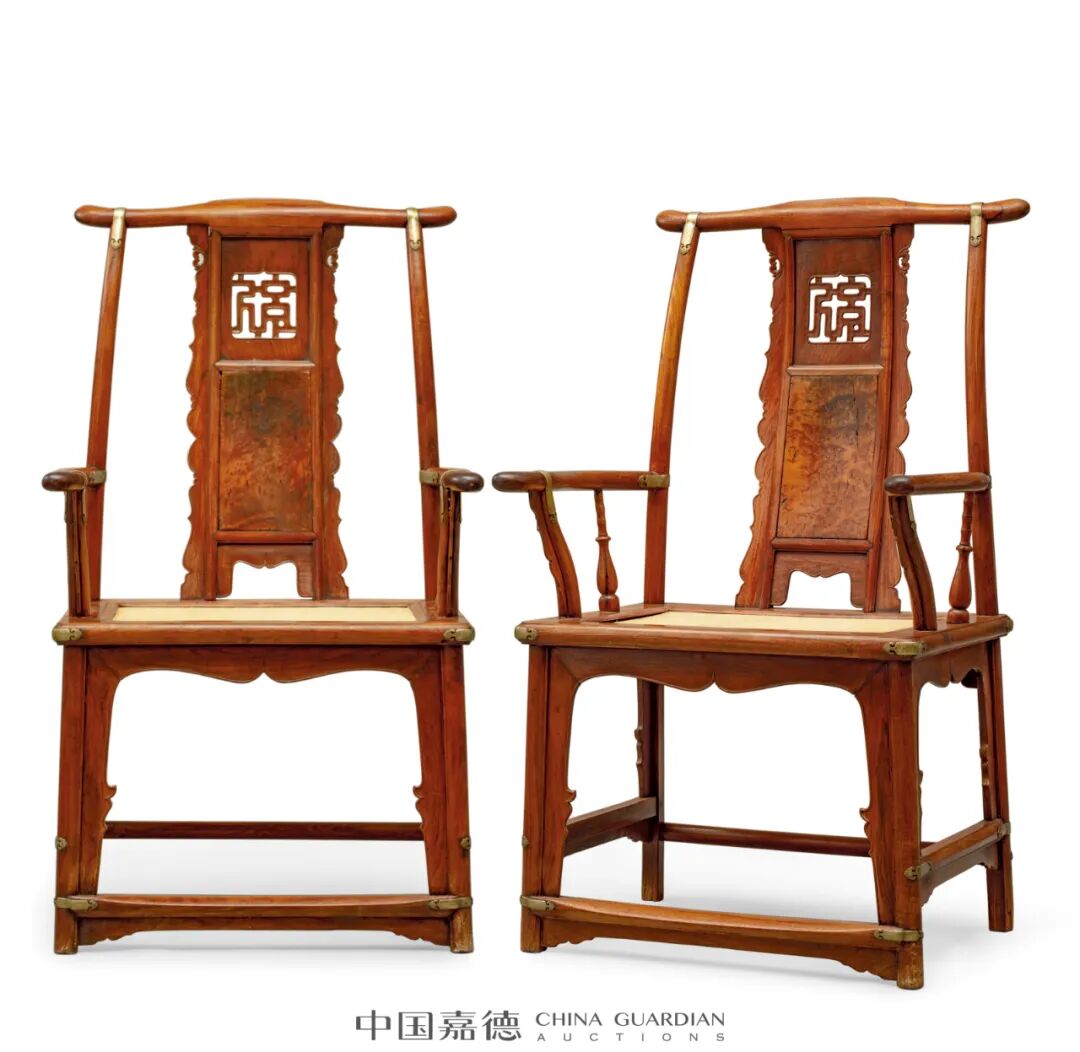 明末清初 黄花梨福字纹大四出头官帽椅成对