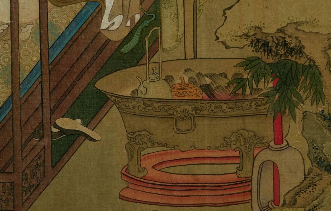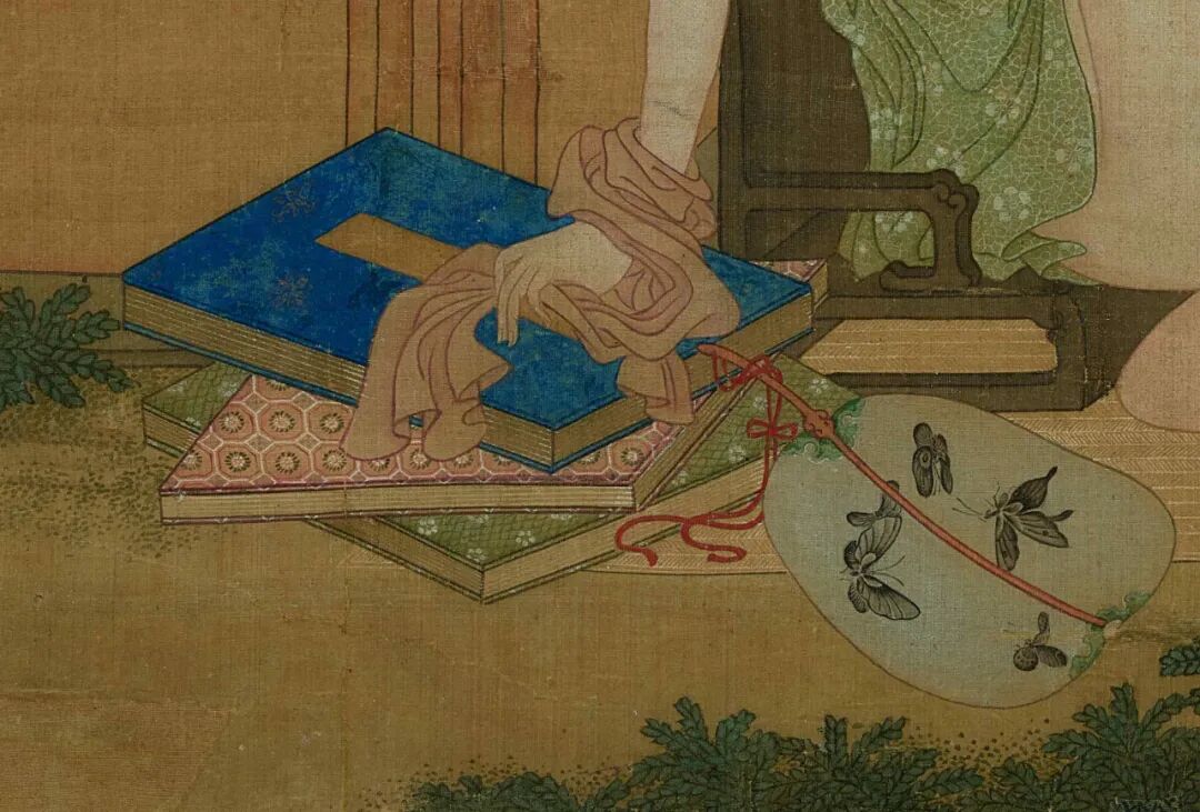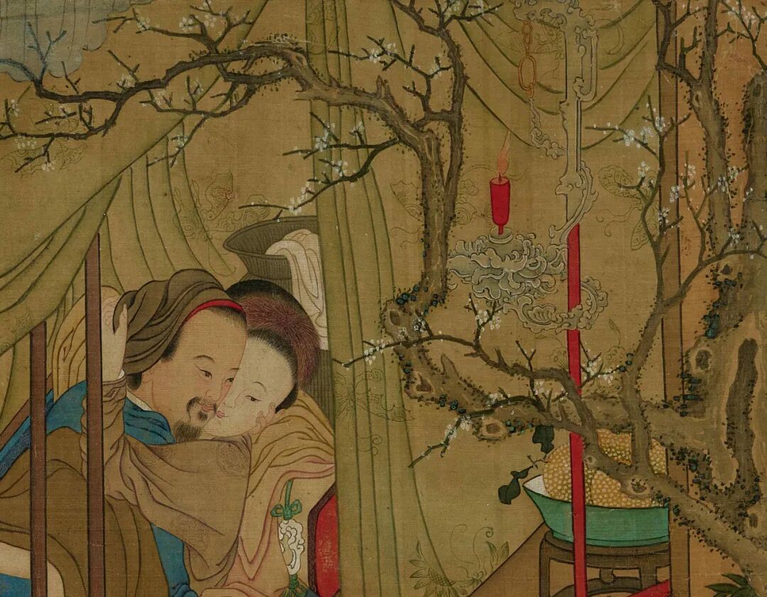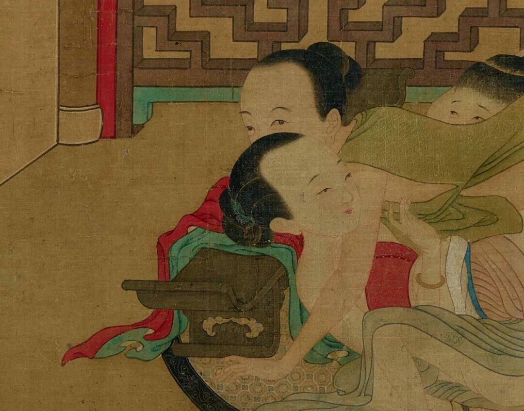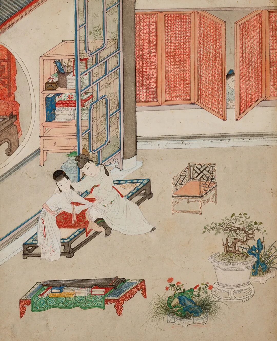 首推卢芹斋旧存康熙御制〈愉悦满园〉册八帧,年少男女,穿戴绫罗宝珠,姿态恣情大方,捕捉情欲横流、宽衣解带之瞬。家具陈设富丽华贵,应是皇家装潢。有画中人直视观者,秋波荡漾,宛若邀诱共嬉。画艺如此细腻生动,应出自任职宫廷的浙派画师之手,可谓中国春画中最精妙之作。