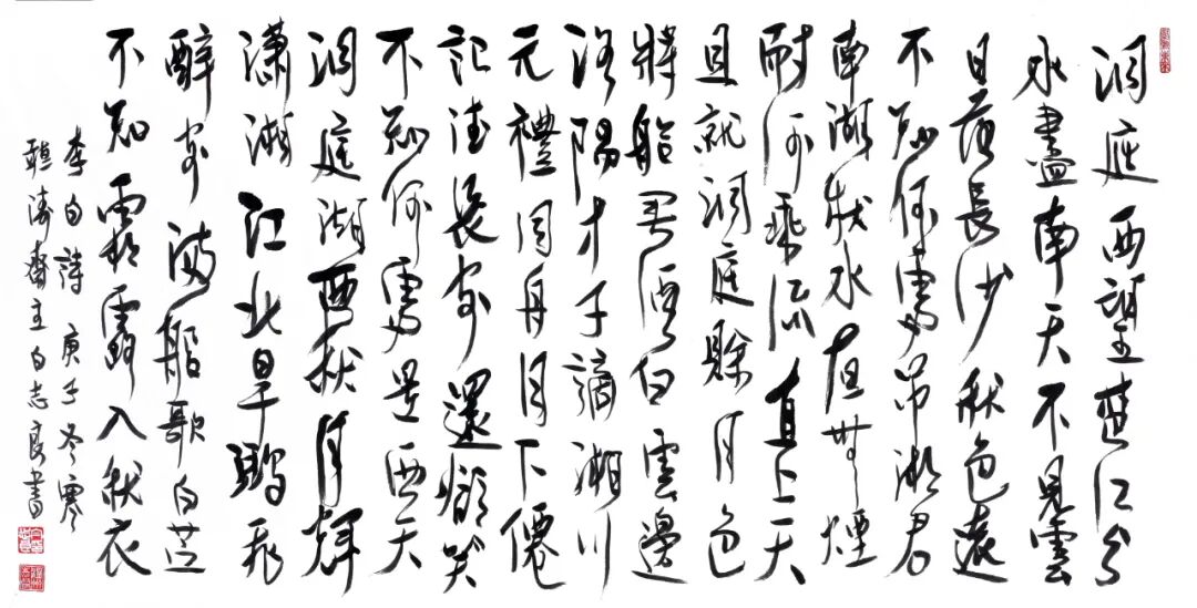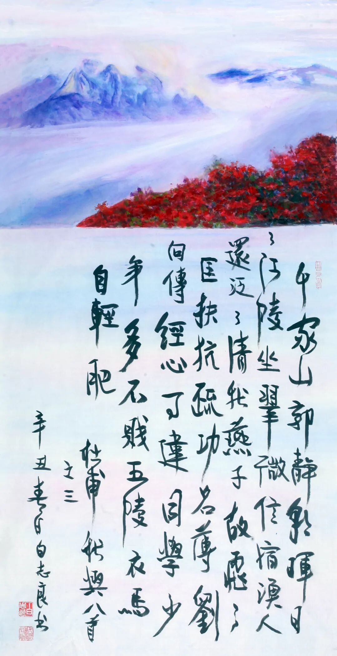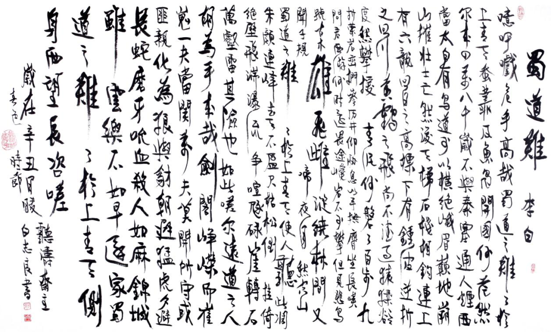二零二一年是中国共产党成立100周年,白志良创作了书法毛泽东诗词全集百米诗文,雄浑浩大,长篇巨制,并展览于中基美术馆,影响非常之深远。