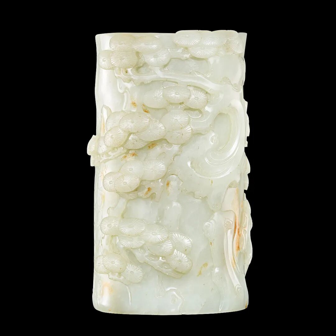 白玉花插肌理细腻盈润。松树桩式,松针如伞,层次井然;山岩兀立,松皮如鳞;虬枝盘曲,苍劲有力。刀法俐落,纹饰自然,可见工匠高超技艺。此花插构思精妙不露俗气,予人浓浓的文人生活品味,置于案几,赏心悦目。
