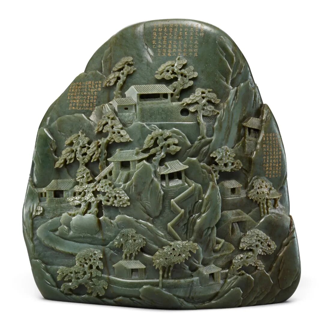 这座精雕细琢的和阗青玉山子,记录了乾隆皇帝对姑苏城外寒山听雪阁的痴迷及怀念。山子定乾隆晚期,上面记录了乾隆由1751年第一次南巡至1784年最后一次进寒山,先后六次驻跸寒山别墅时所赋御制诗六首。此山子可以让乾隆皇帝将这片他所留恋但无法再访之地留在他身边,留在他的宫墙之内。同时也像征着南巡原来的政治目的,为帝国的稳定与繁荣,强化了汉族士大夫对清王朝的政治认同。