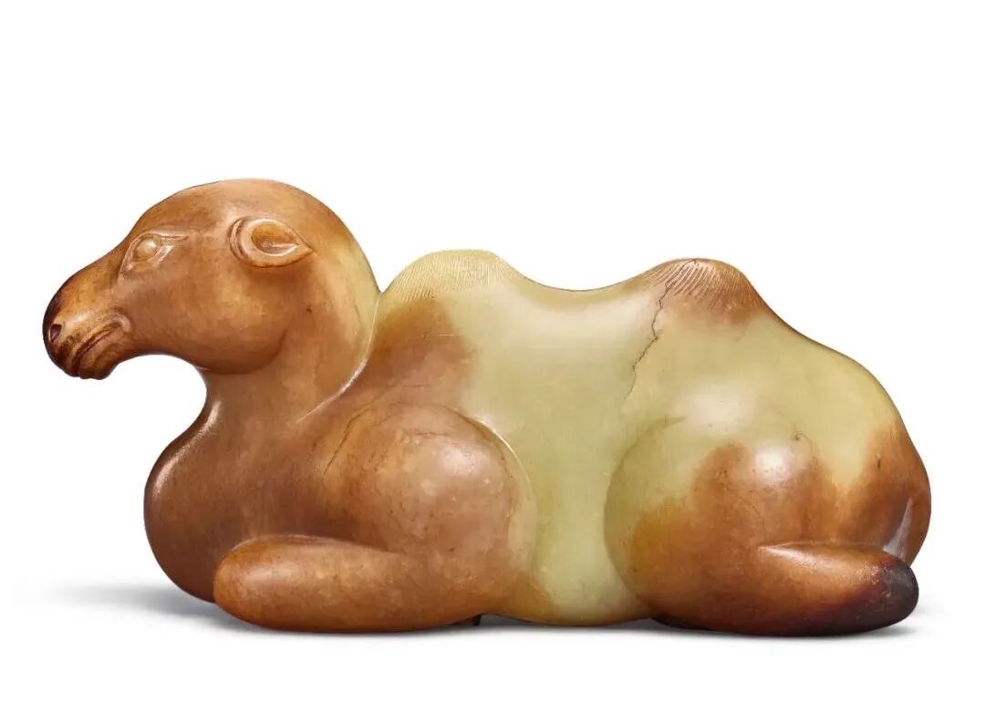 黄玉骆驼雕工灵动,玉质润泽,巧妙效拟驼毛皮色,尺寸硕大,甚是珍稀。骆驼题材艺作虽罕,但明十三陵神道上石雕六兽中,骆驼仅排在狮子与獬豸之后,比象、麒麟、马还要前,足见其重要性。石雕杏目厚唇,双峰鬃毛毕现,四足矫健,形态与此相近。