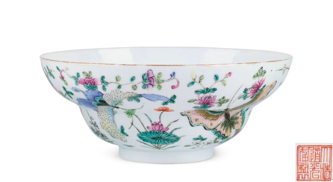 碗形成型不易,胎质细腻,釉色温润。内壁素白,外壁绘粉彩蝴蝶纹,蝴蝶形态各异,翩翩起舞。底书“大清道光年制”款。