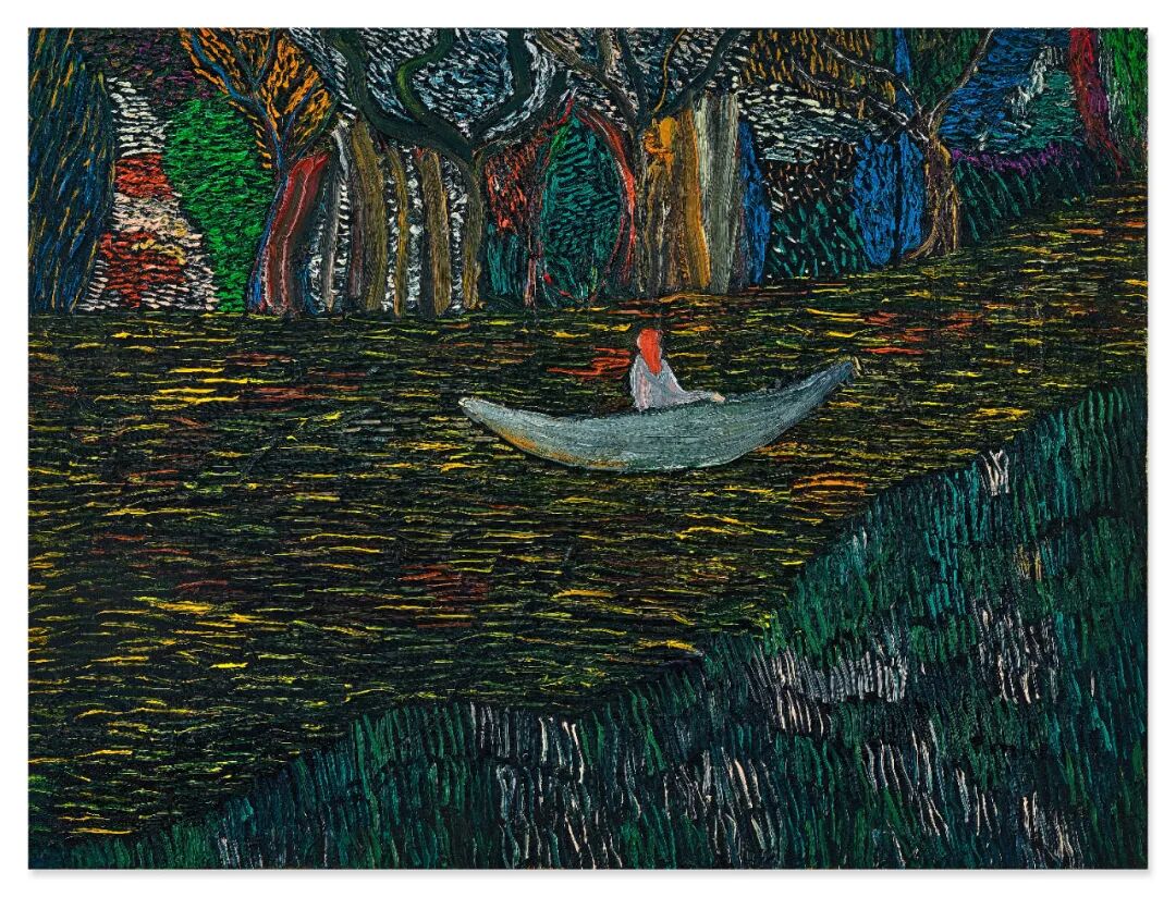 王俊杰的后期画作经常出现一个脸部模糊不的人,他总是形单影只,在山间的蜿蜒小径上独自漫步,又或如同《丛林》中所见,在无边无际的水中央撑着一艏简单的小船。王俊杰的作品一如这幅《丛林》一般,主题虽似随意,但却能深深触动人心,勾起观者内心鲜为人知的孤独,引起极大共鸣,足以见证画作强烈的视觉力量。