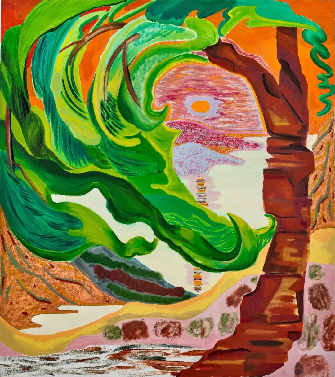 美国艺术家莎拉休斯以绚烂灵动的想象风景闻名,《醉醺醺》(2016年)可谓当中的典范佳作,那饱和浓稠的色调予人温暖和煦之感。曾经,休斯的作品被认为象征意味强烈,为了消除其中的叙述声音,休斯转向描绘风景,其笔下的景色疑幻似真,具有某种超脱凡尘的特质。