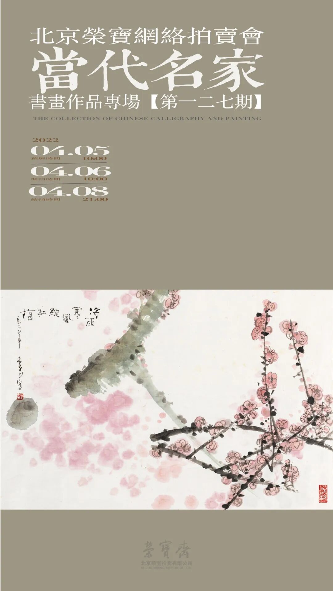 北京荣宝·当代名家书画作品专场网络拍卖会(第一二七期)将于4月5日10:00—4月6日10:00开启线上预展,并于4月6日10:00开拍,4月8日21:00结拍。