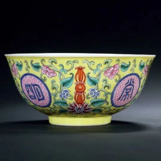清道光 黄地洋彩“佛日常明”碗一对