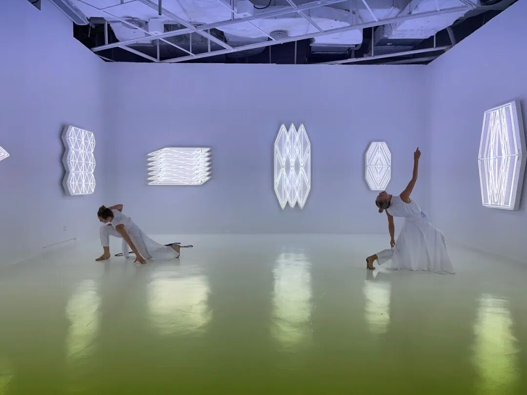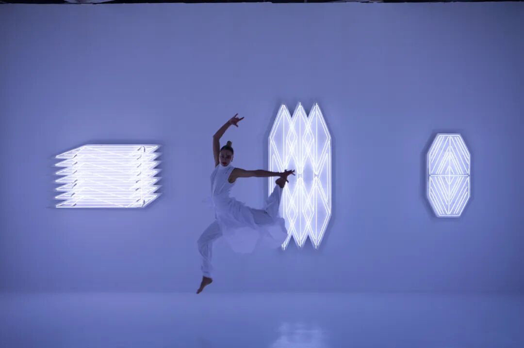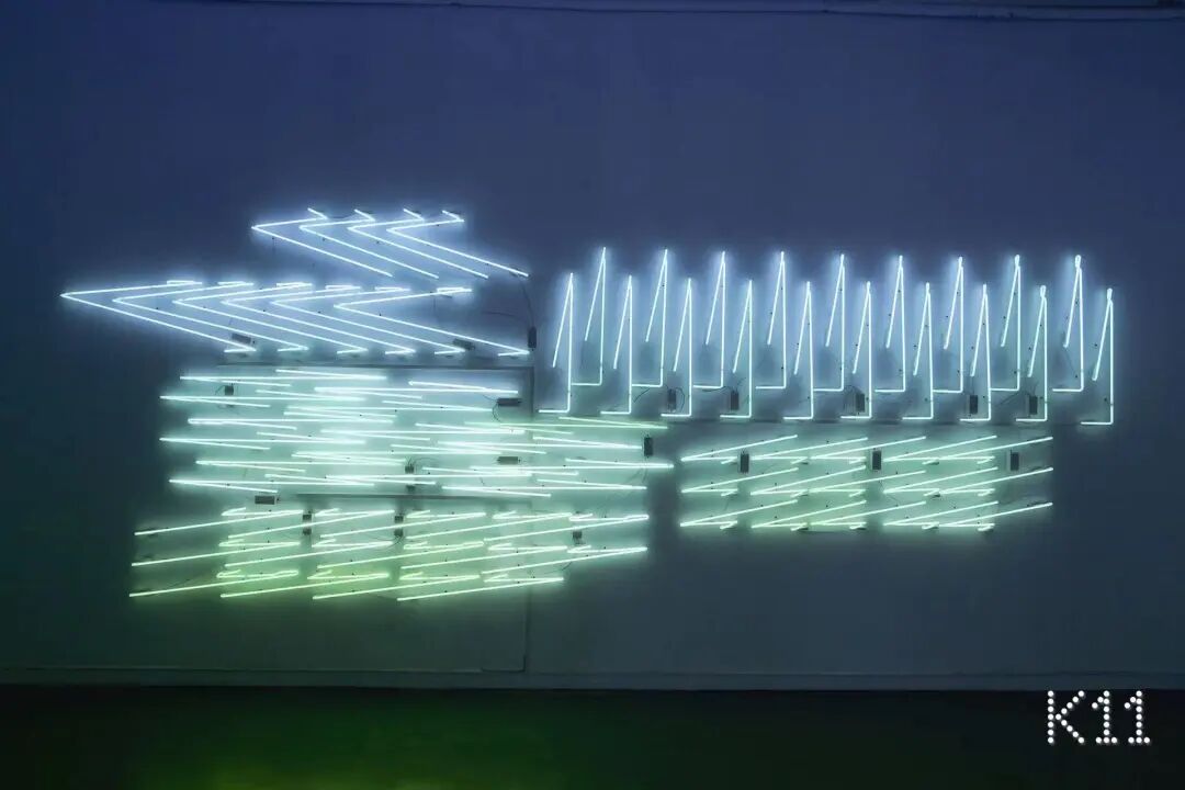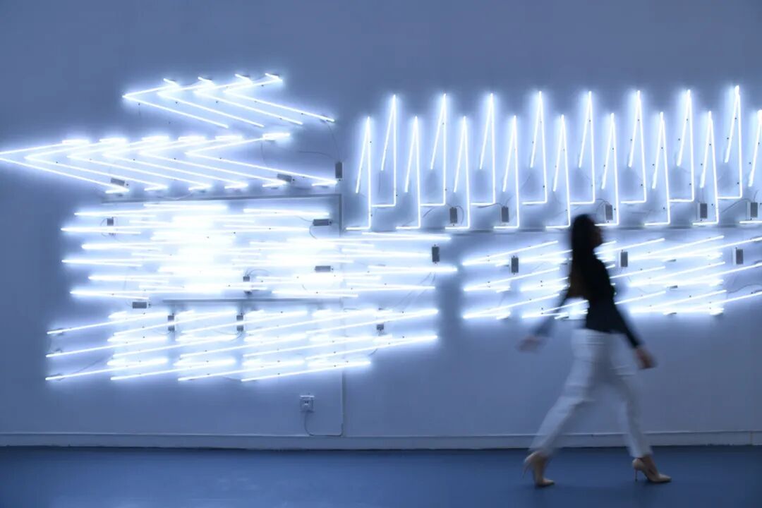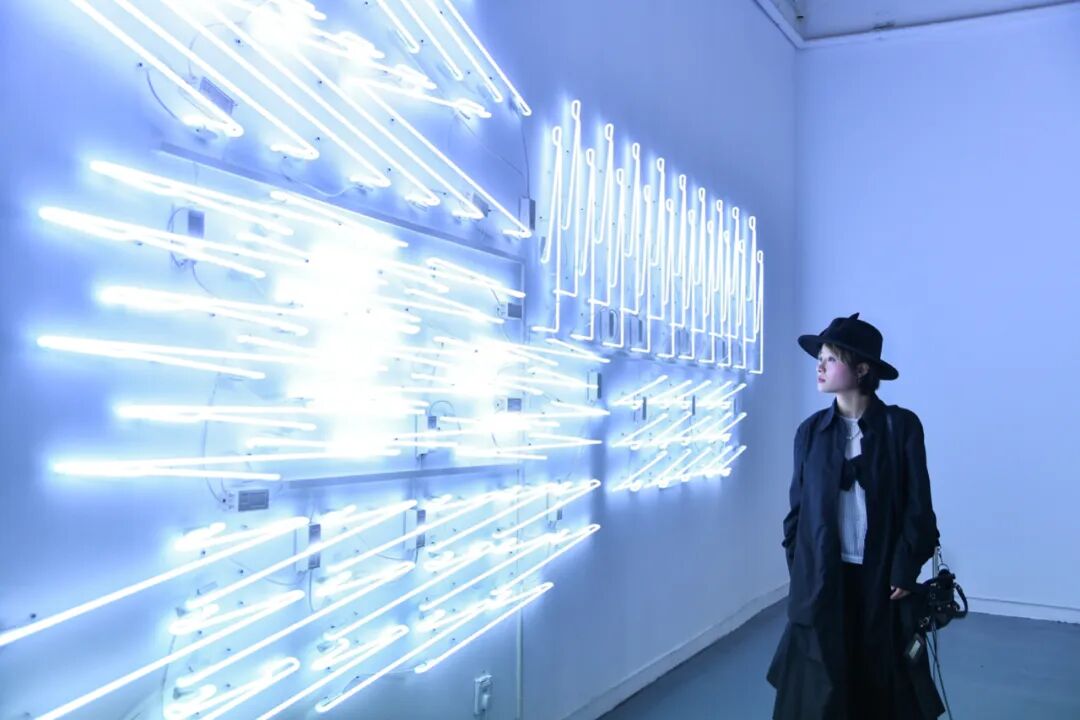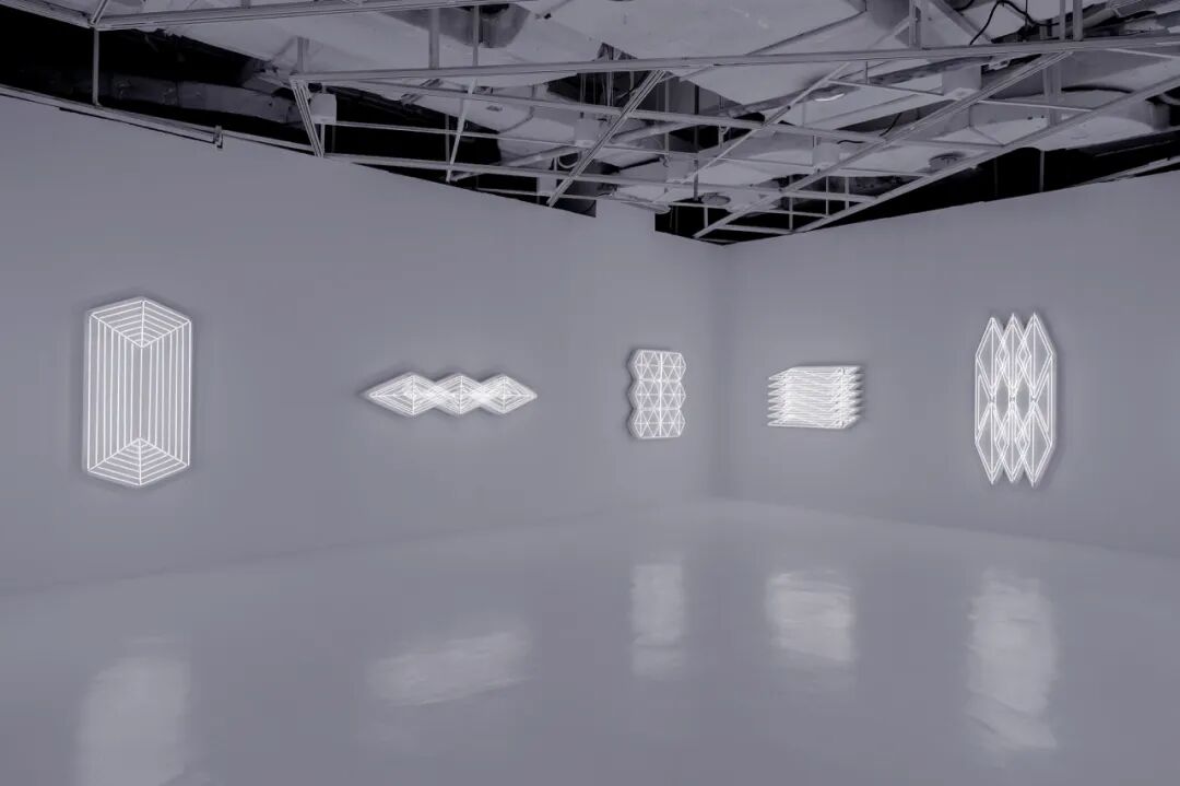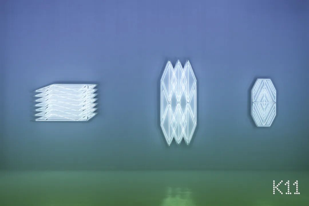 在近100平方米的方形空间中,环绕着十个几何形的白色霓虹灯牌。《照明》以工作场所的照明标准来重置白色灯管,并通过对其形态上的扭曲使灯牌呈现出狭长的、对称的、规则的、尖锐的几何形图像,对空间进行直接干预,探讨工业生产、城市化进程的关联。更特别的是,当观众透过手机、相机等影像设备观看时,作品跳脱原始的纯白色,呈现青蓝动态渐变的“所见非所得”效果,以此传递反同质化的生活态度与精神号召。