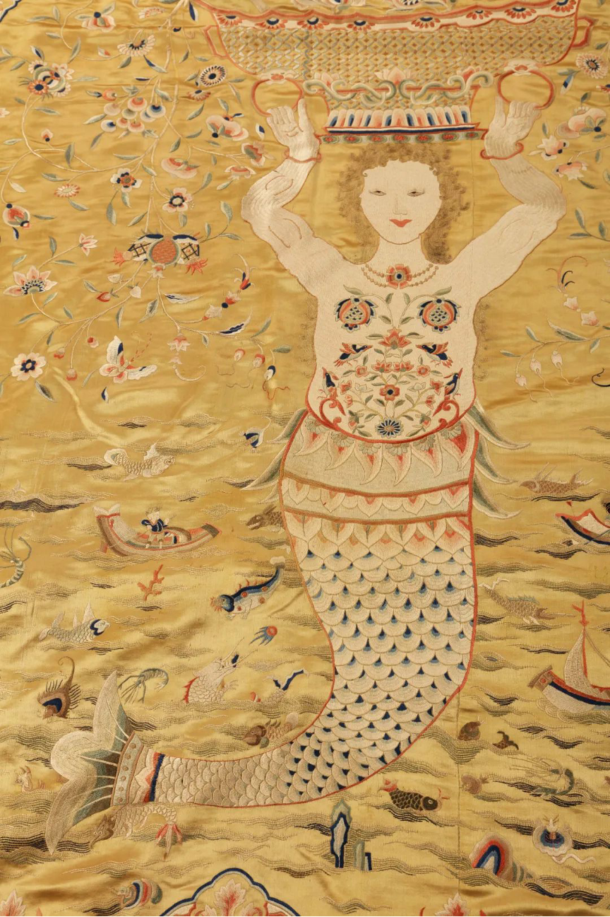 清米黄色绸缎广绣美人鱼、花鸟纹床围广东省博物馆藏