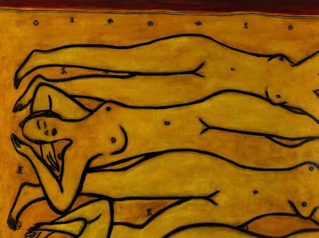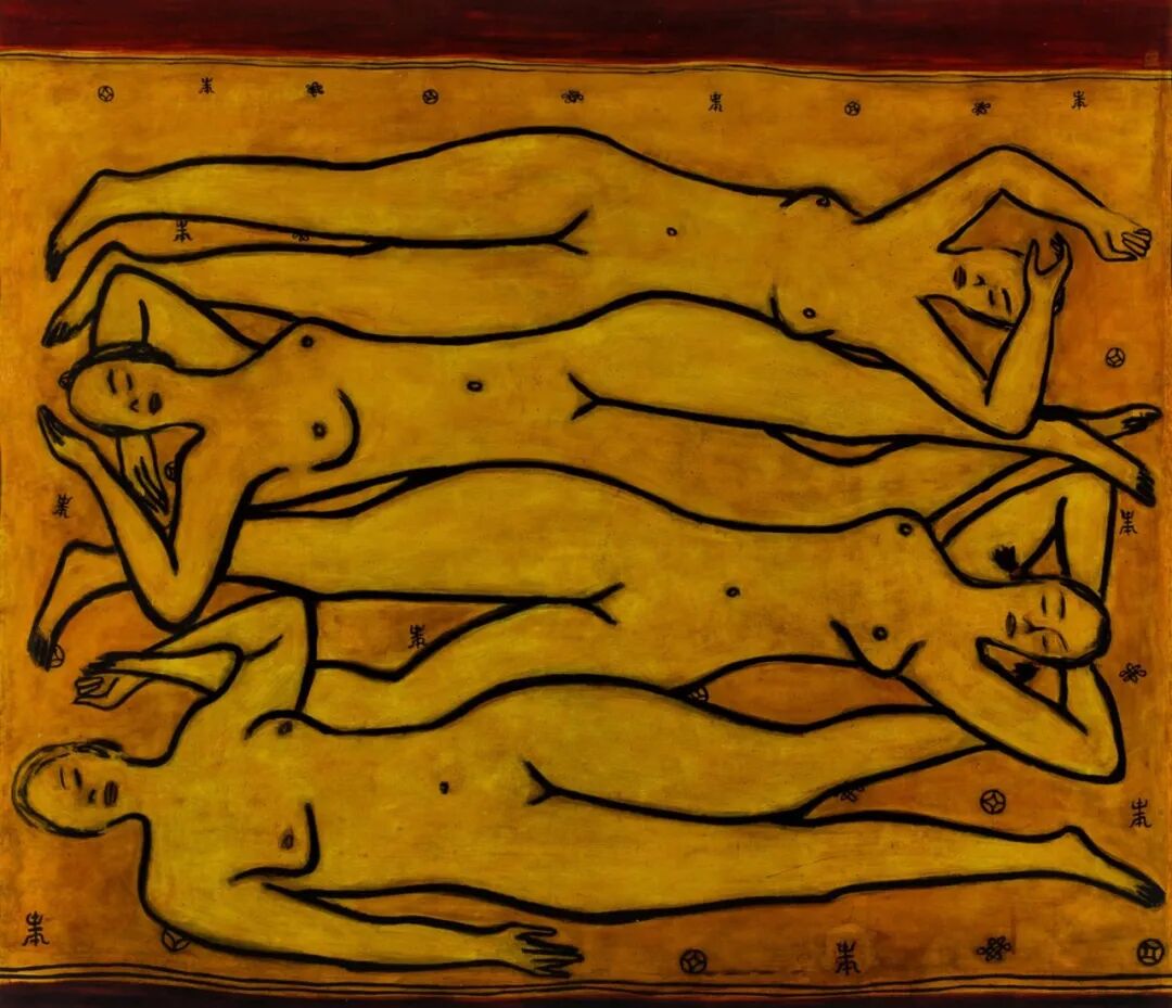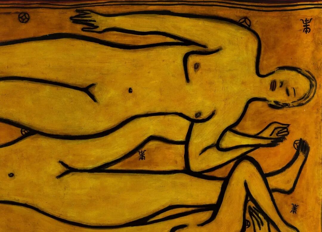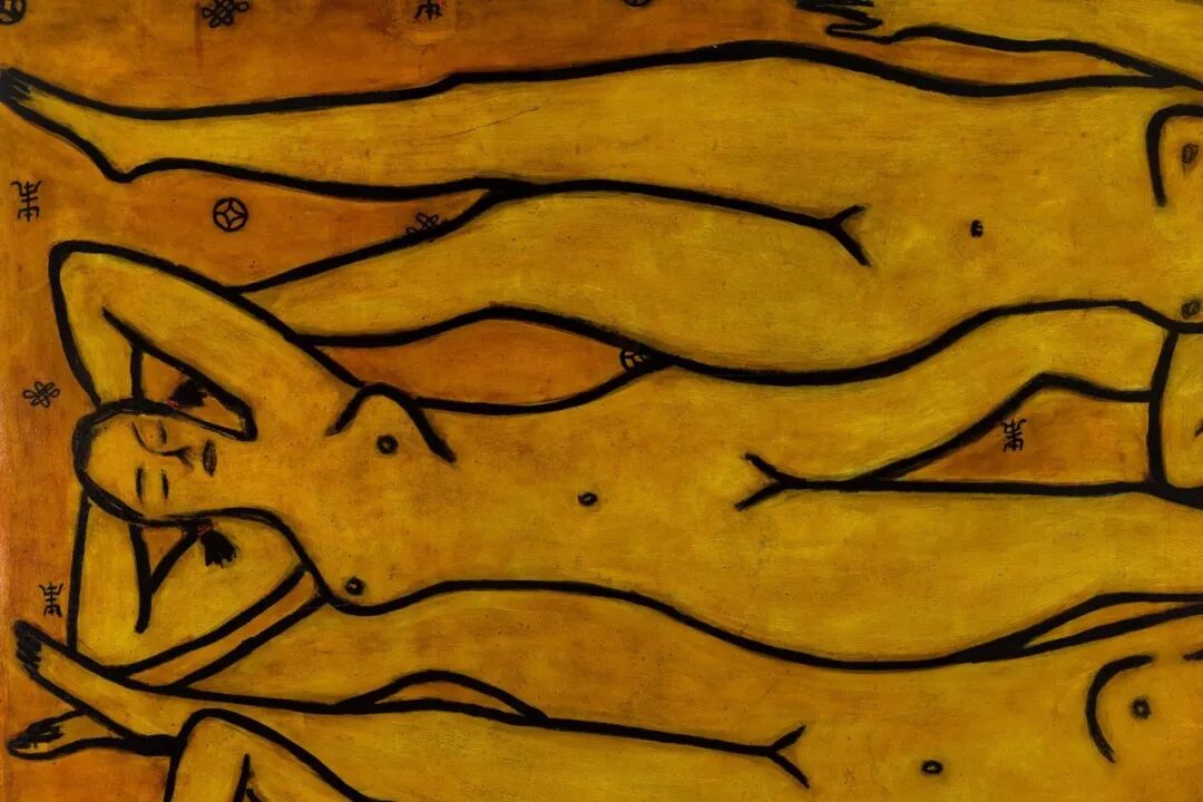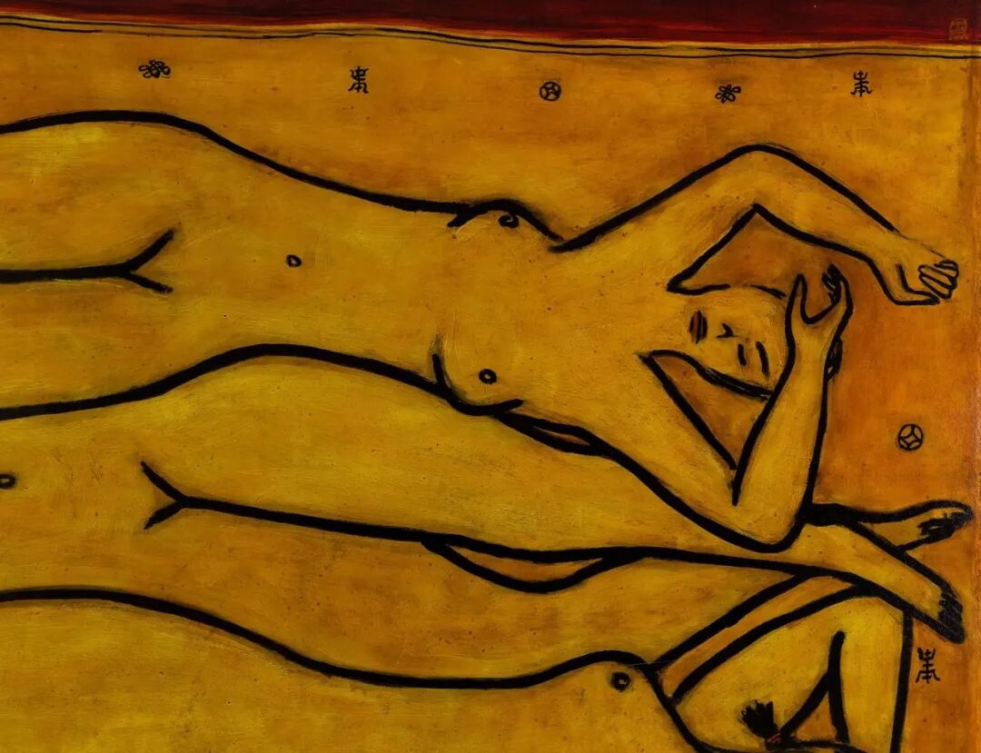 画中的四位裸女相互勾叠,其中三位裸女的线条互相构成身体轮廓,紧密相连,另一位裸女则自成另一方向,这种构图方式是常玉绘画的一大特色。裸女五官仅寥寥几笔简单描绘,四位裸女呈金黄色,轮廓则以粗黑线勾勒,背景以极具中国特色的吉祥象征:福、禄、寿为装饰,在整幅画作中添加温馨、浪漫的美感。