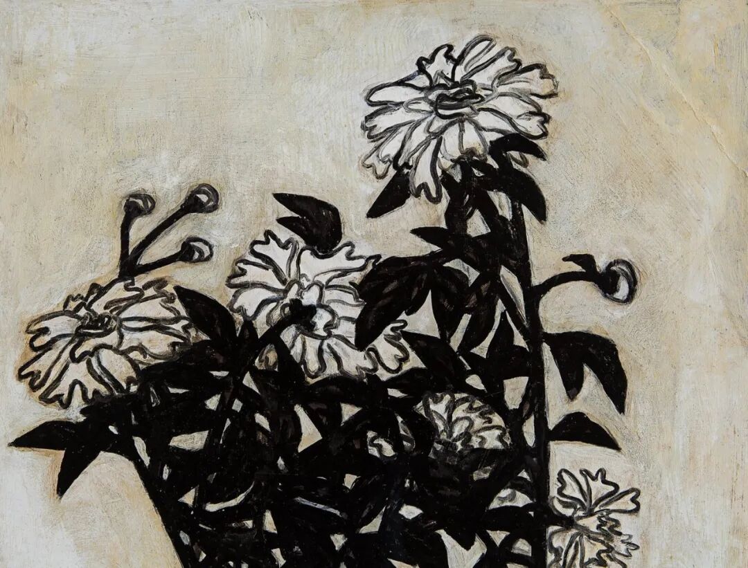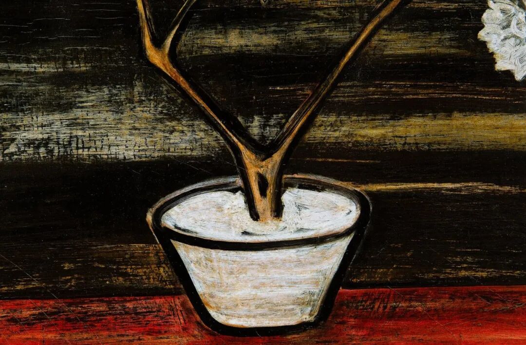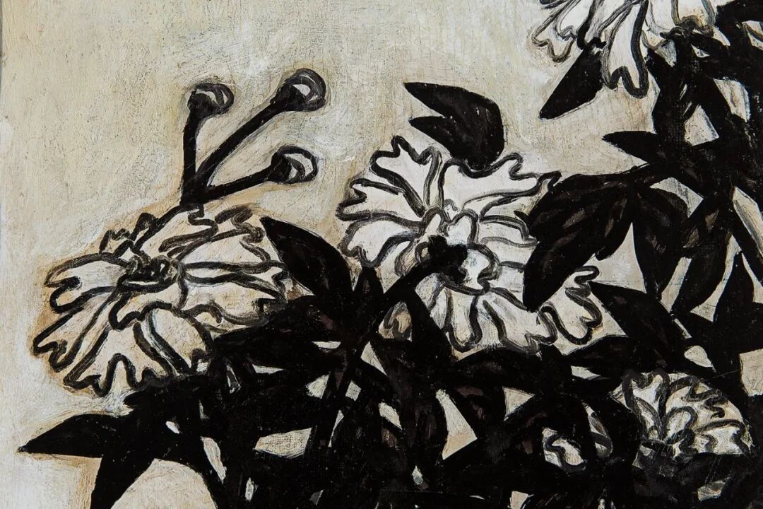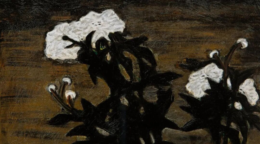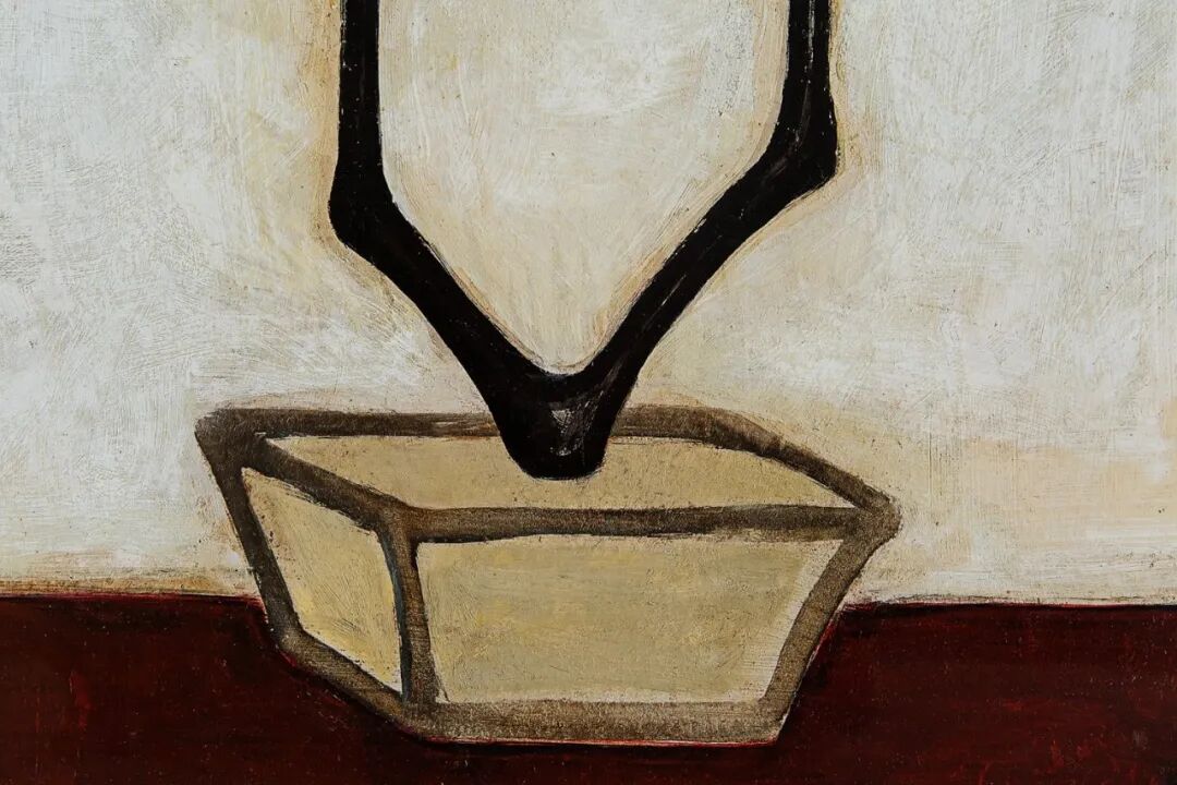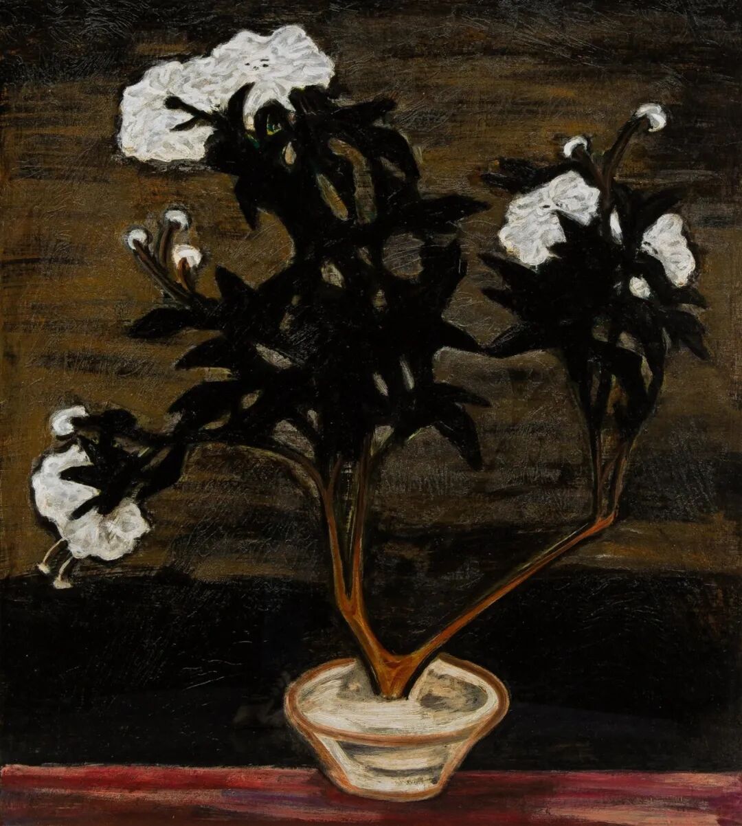 1940至1950年代,常玉的瓶花创作展现更丰富多彩的面貌,表现更多元变化的结构布局和审美体验,《花》正属于这个时期的佳作。此作品采用的是三角构图的布局,黑叶白花搭配淡淡的紫色桌面,营造出一股高雅的质感与色调。