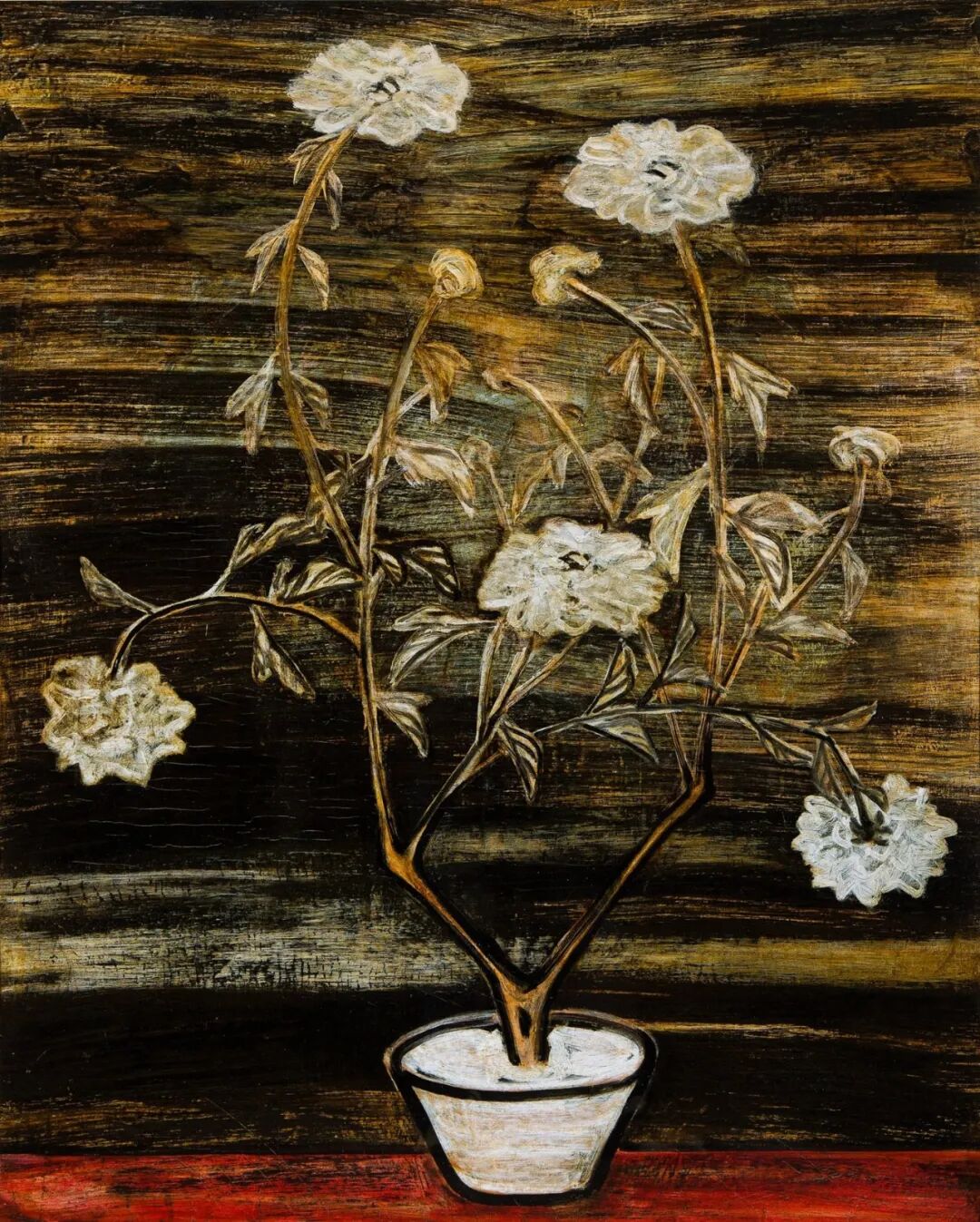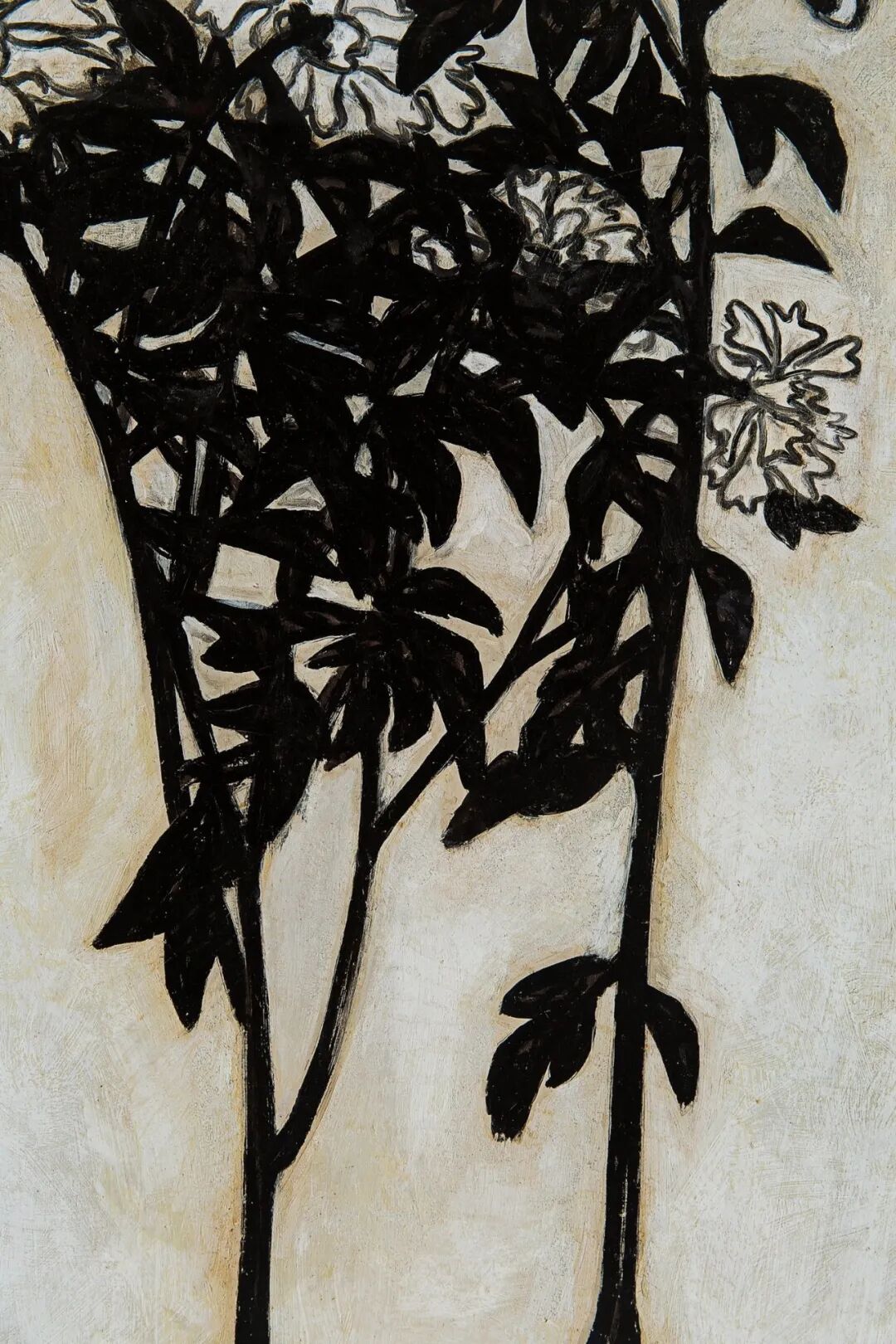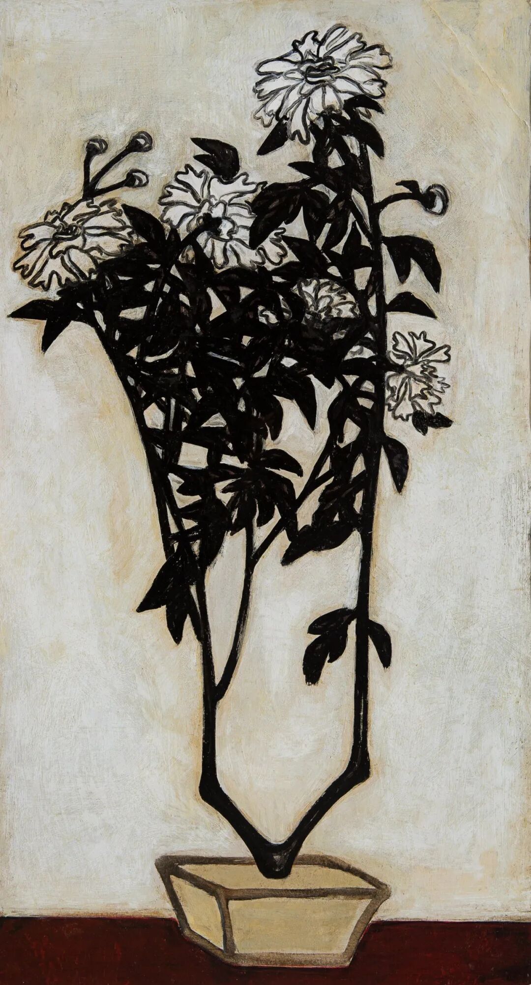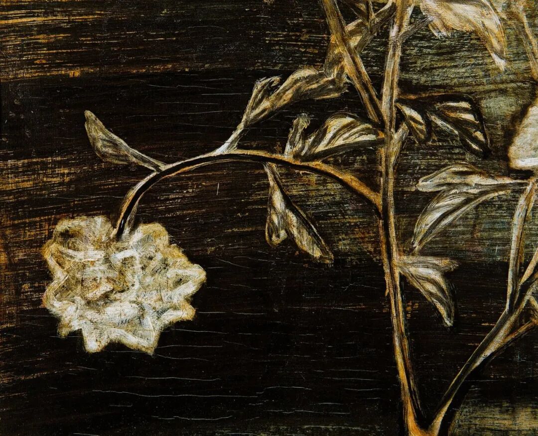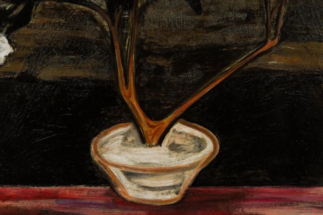 1940至1950年代,常玉的瓶花创作展现更丰富多彩的面貌,表现更多元变化的结构布局和审美体验,《花》正属于这个时期的佳作。此作品采用的是三角构图的布局,黑叶白花搭配淡淡的紫色桌面,营造出一股高雅的质感与色调。