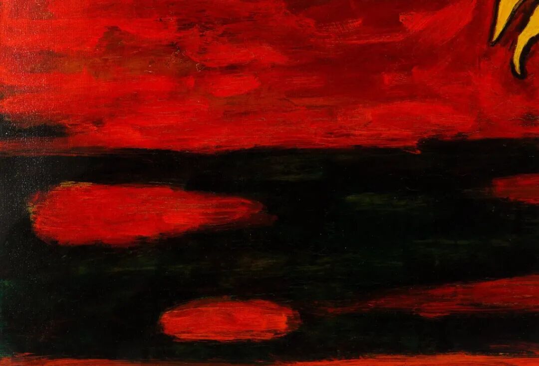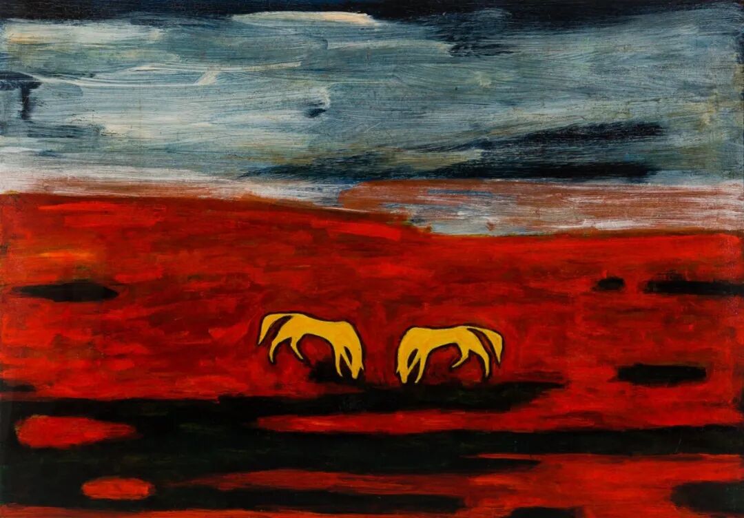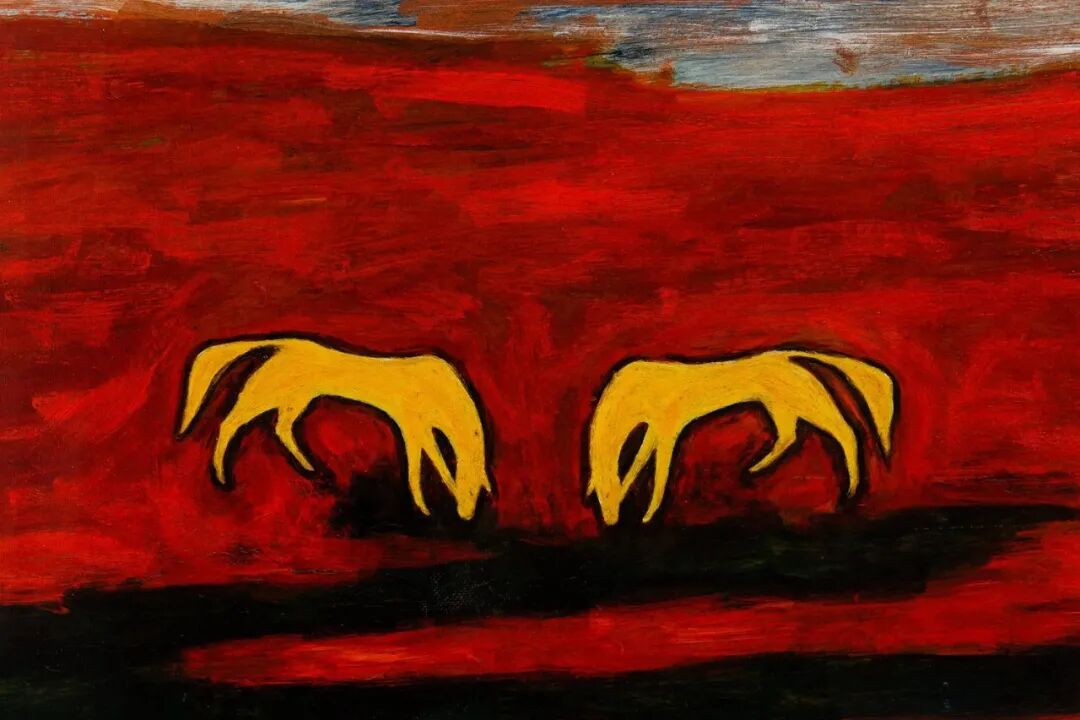 "马"是常玉动物作品中最钟爱的主题,对"马"这个题材持续的艺术探索横贯常玉近四十年的创作生涯。常玉多以描绘两两相依的双马为主,这或许是常玉与妻子爱情的拟化,此幅作品运用大笔触铺底,在单纯的色块上做出肌理的变化,两只垂首而立的黄马出现在前景的画面上,给苍茫的画面中添了一丝温情。
