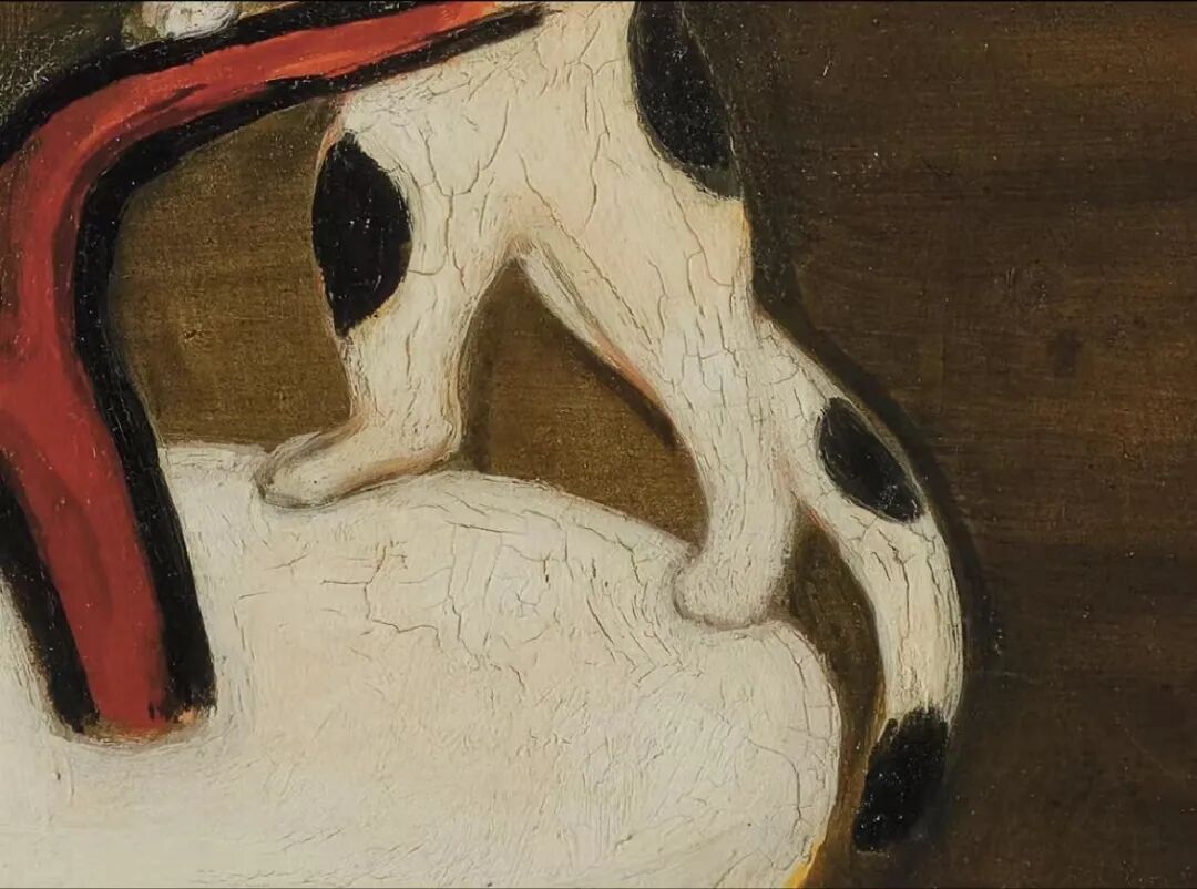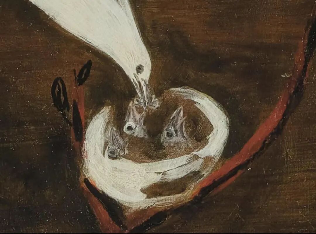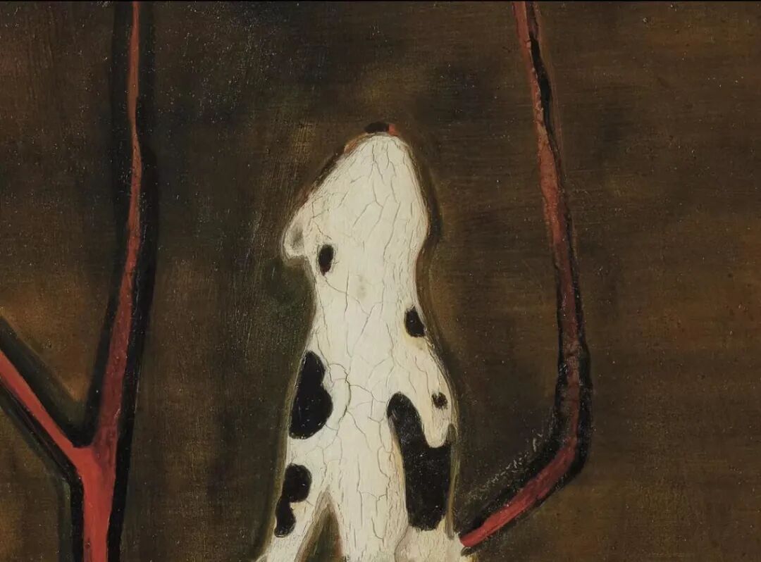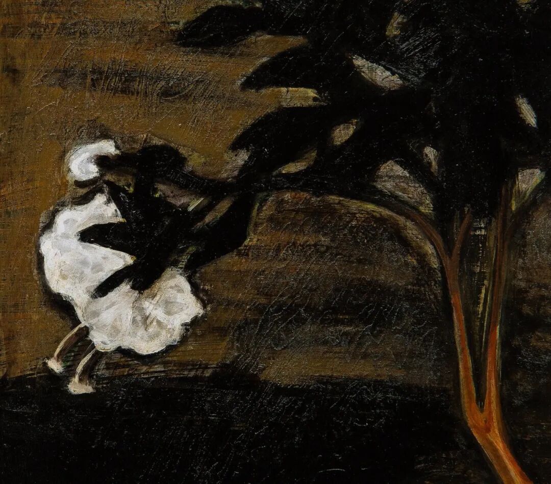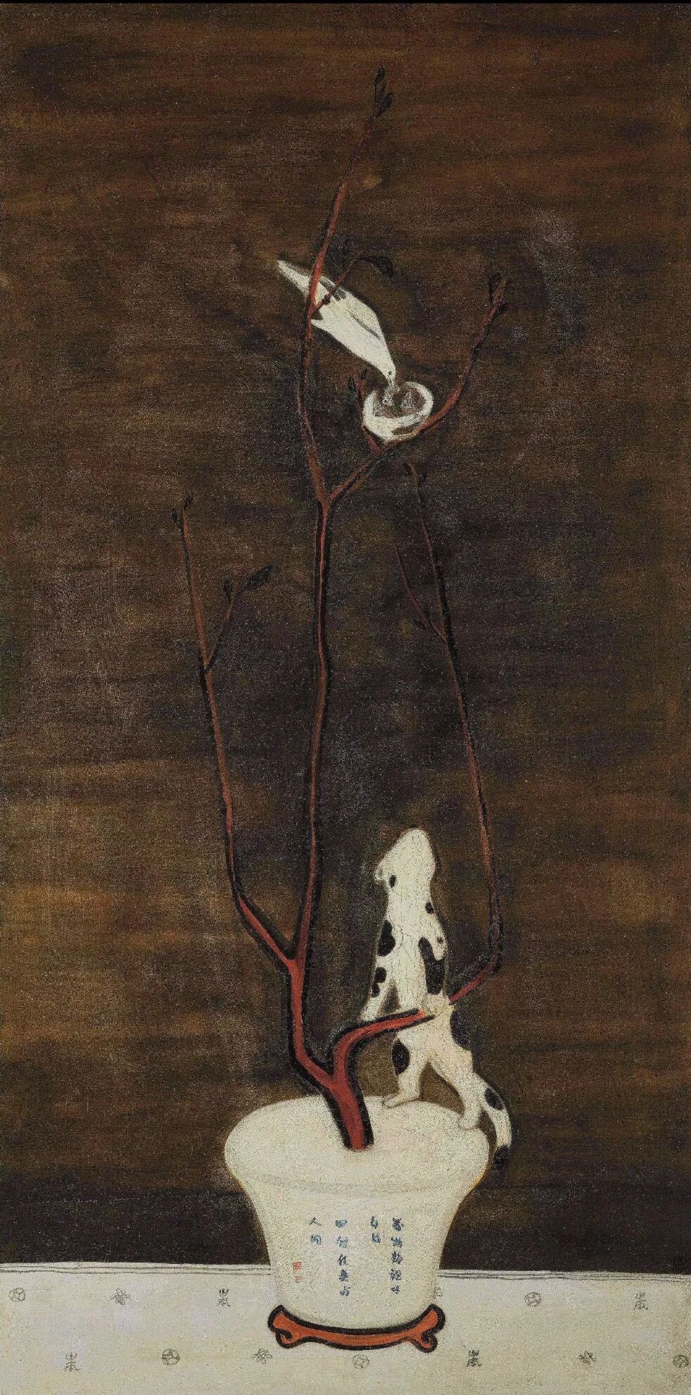 引颈且伺机而动的猫,觊觎枝桠高处的母雀与巢穴中的小雀,画面充满故事性和蓄势待发的张力。以深棕色油彩厚涂背景,主体置于中央,构图简练,用色古朴,线条极具金石之趣,富有中国文人雅趣。盆器上题字:”万物静观皆自得,四时佳兴与人同“曾不止一次出现在常玉的作品中,常玉有意援引此句为自身写照,在《猫与雀》中呈现一种简单愉悦的宁静状态,达到了一种物我相亲、悠然自得的境界。