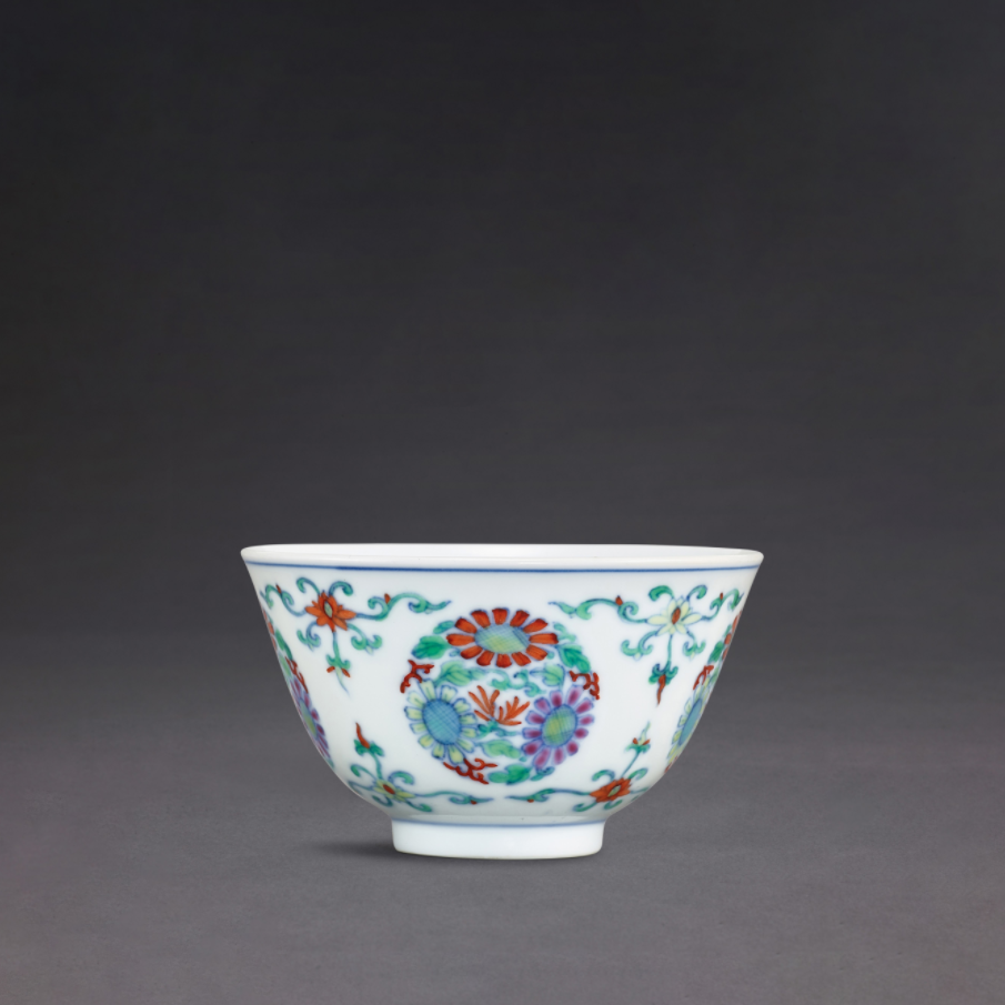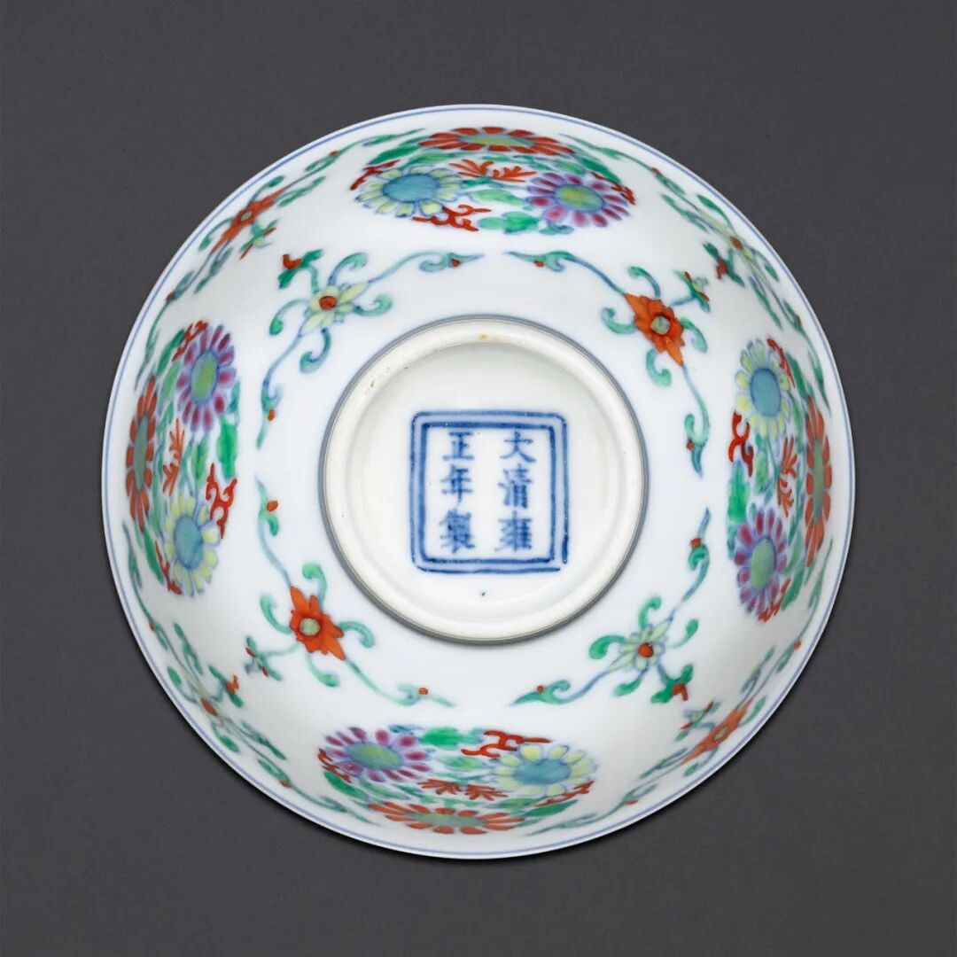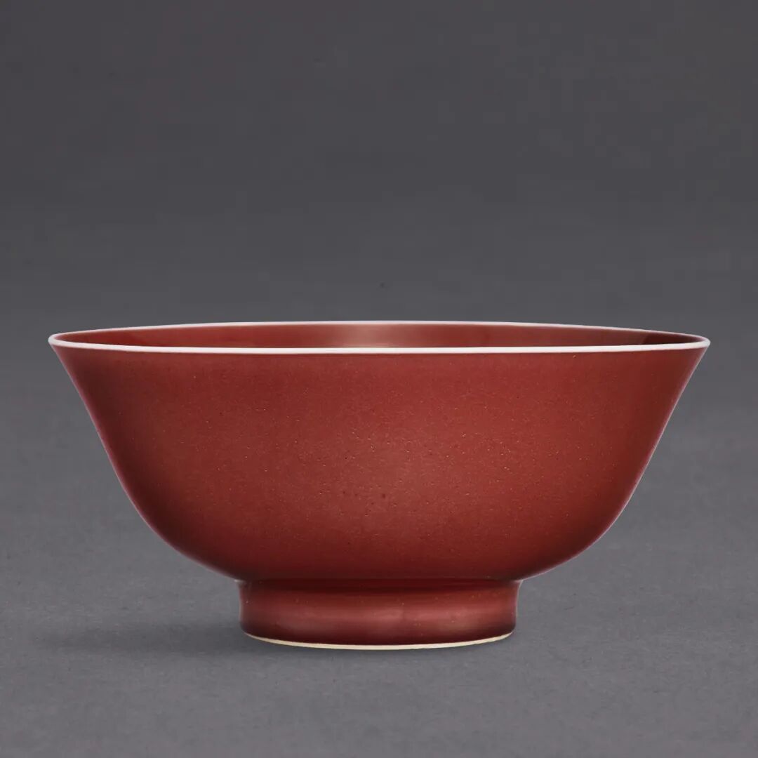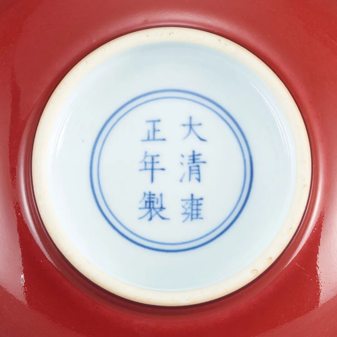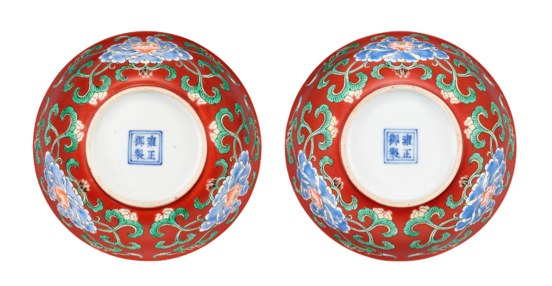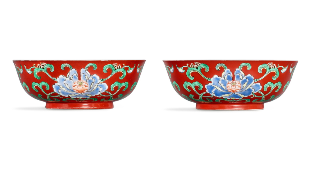 Lot 6 清雍正 珊瑚红地五彩折枝花卉纹浅碗一对